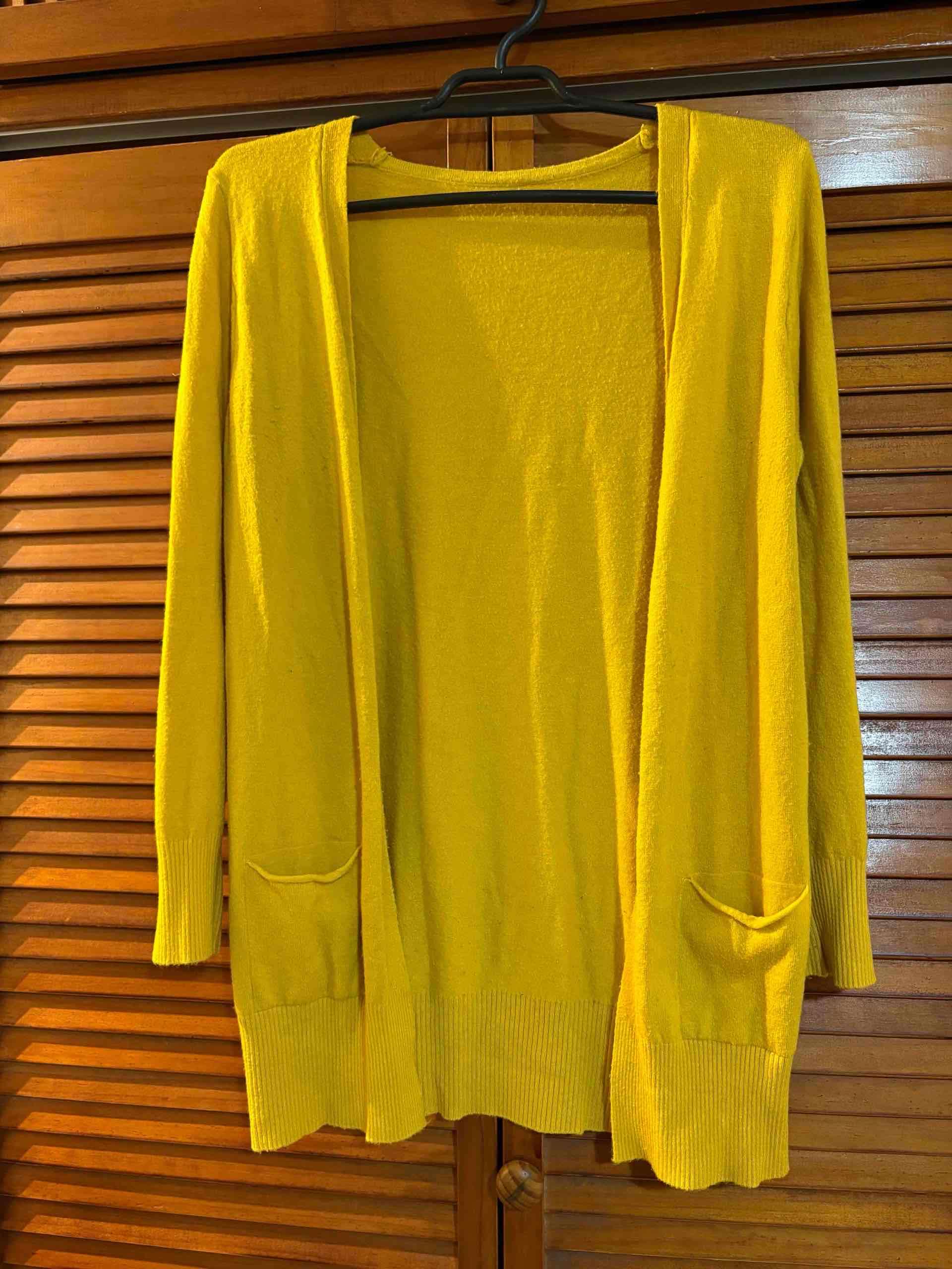 Cárdigan largo amarillo, ideal para combinar en días frescos. Buen estado sin daños visibles.