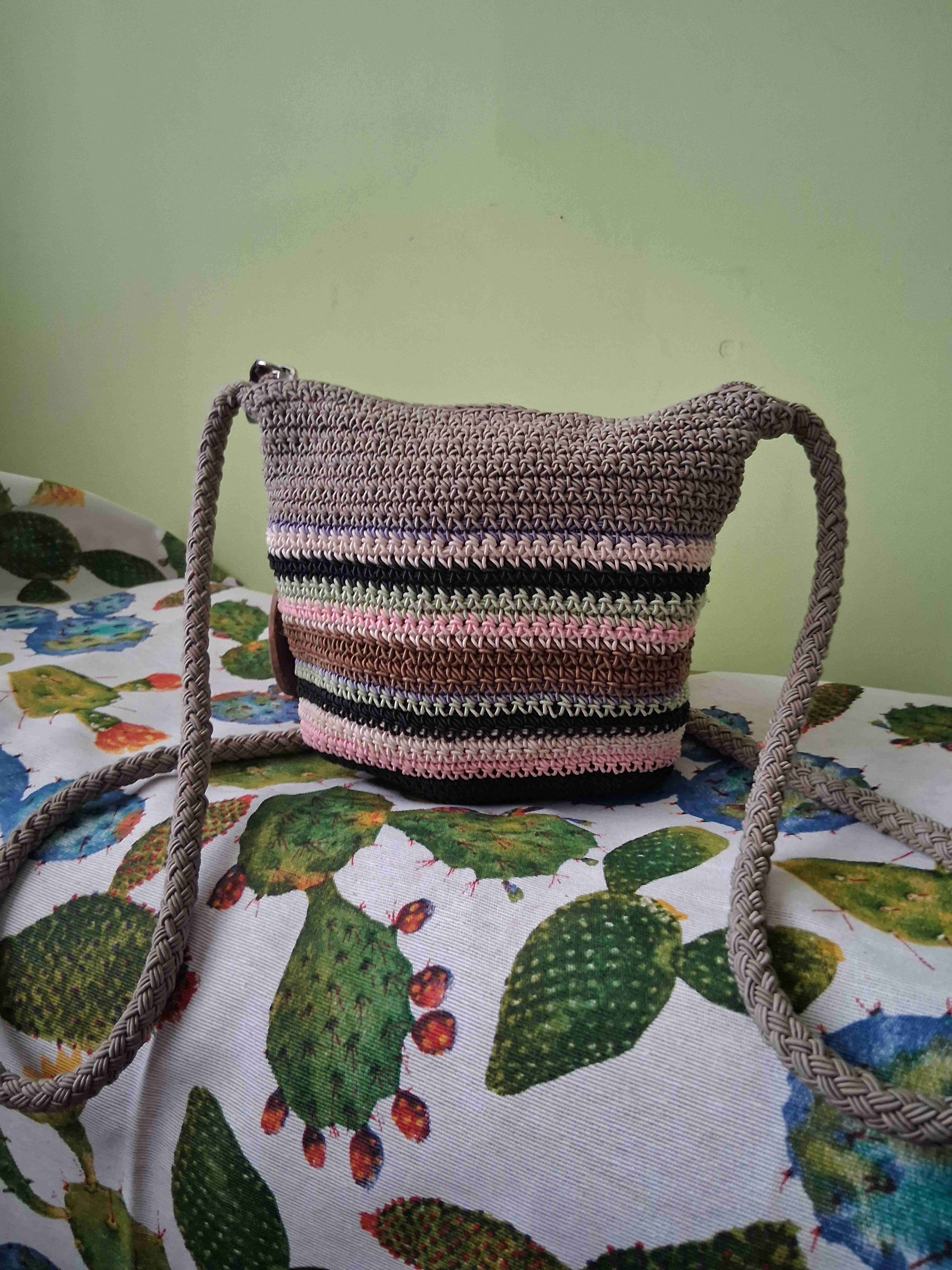 Bolso de hombro de hilo tejido a rayas. Ideal para un look casual de verano.