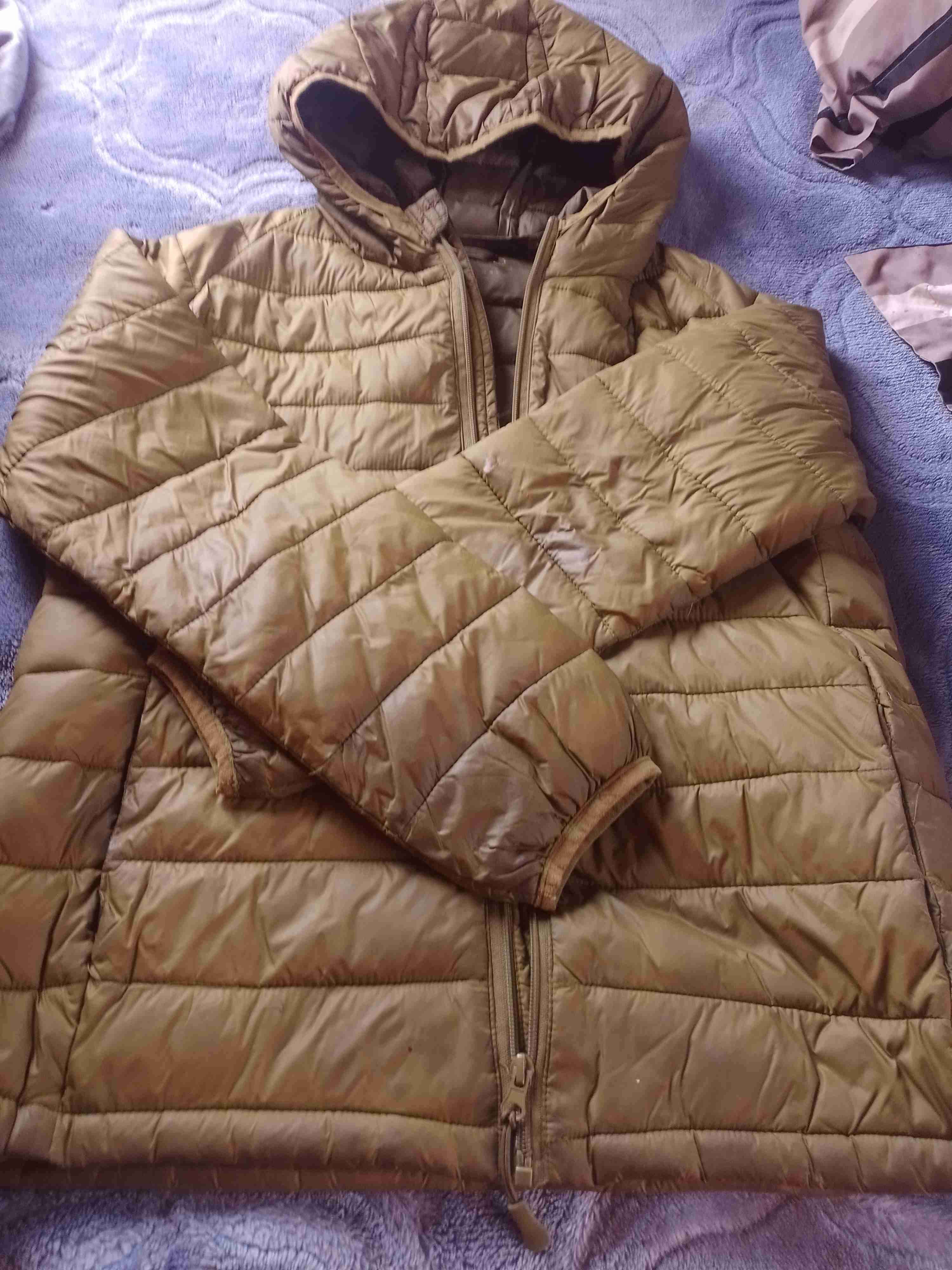 Parka de color café, acolchada y con capucha. Ideal para el invierno, en buen estado general.