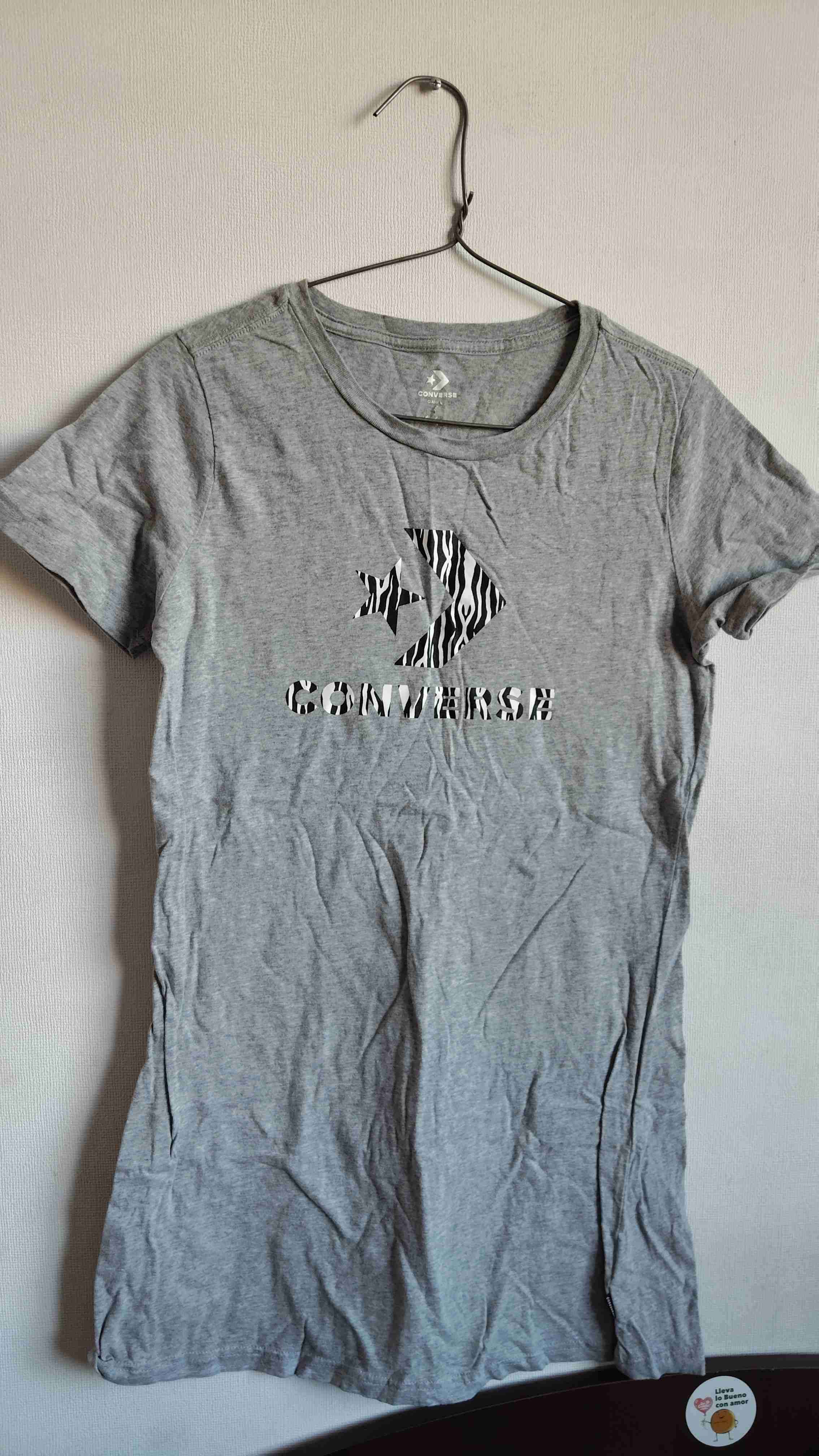 Polera gris con estampado de diseño Converse en la parte frontal. En buen estado, ideal para un look casual.