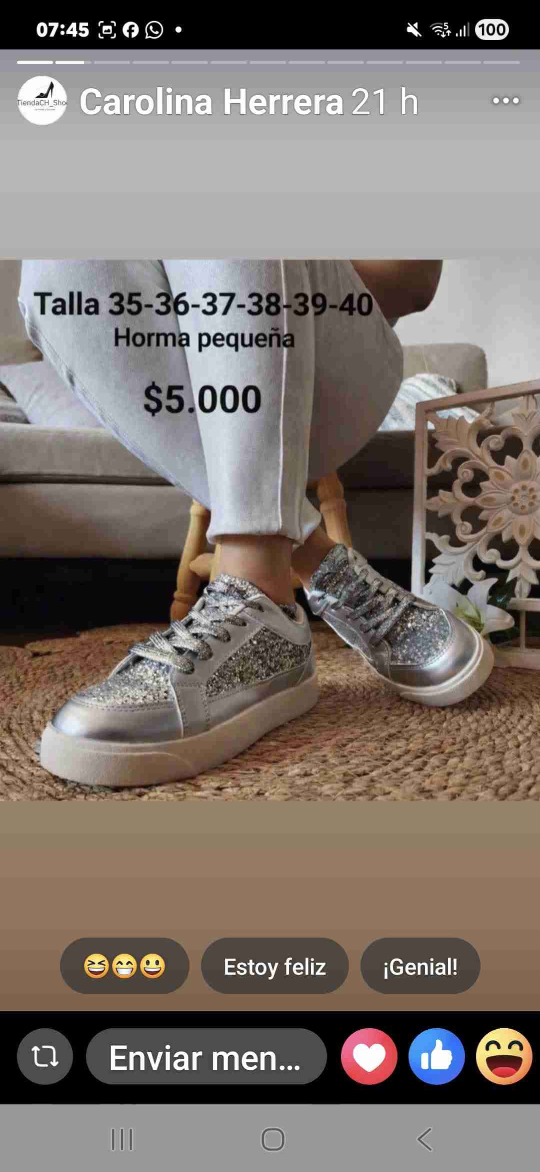 Zapatillas deportivas plateadas con diseño brillante, perfectas para un estilo casual. Tallas disponibles 35-40, horma pequeña.