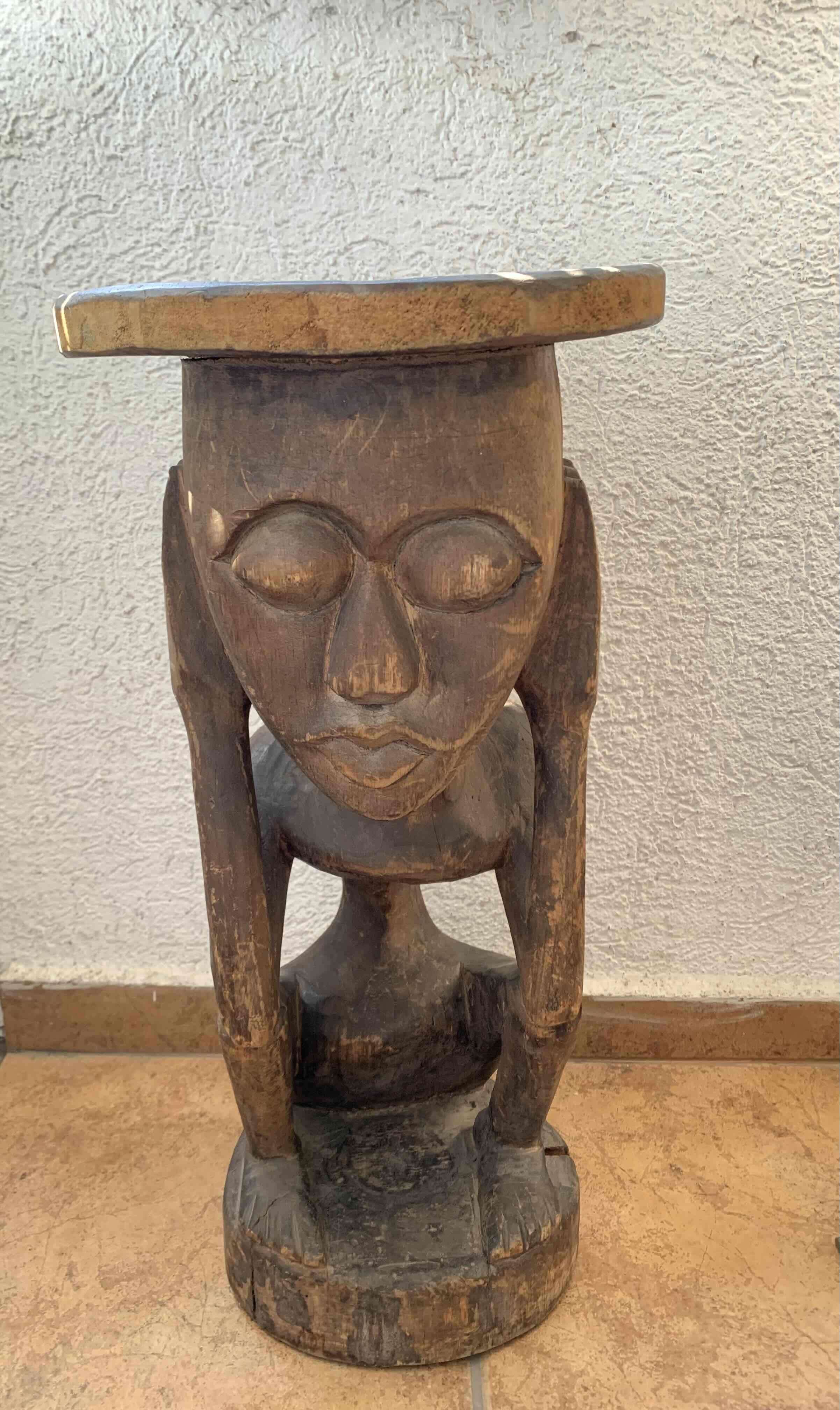 Figura taburete tallada a mano africana con diseño artístico. Ideal para decoración rústica. Interior o exterior sirve como soporte de plantas. Buen estado general con signos de uso. Medidas: 52cm alto, 26cm diámetro base superior