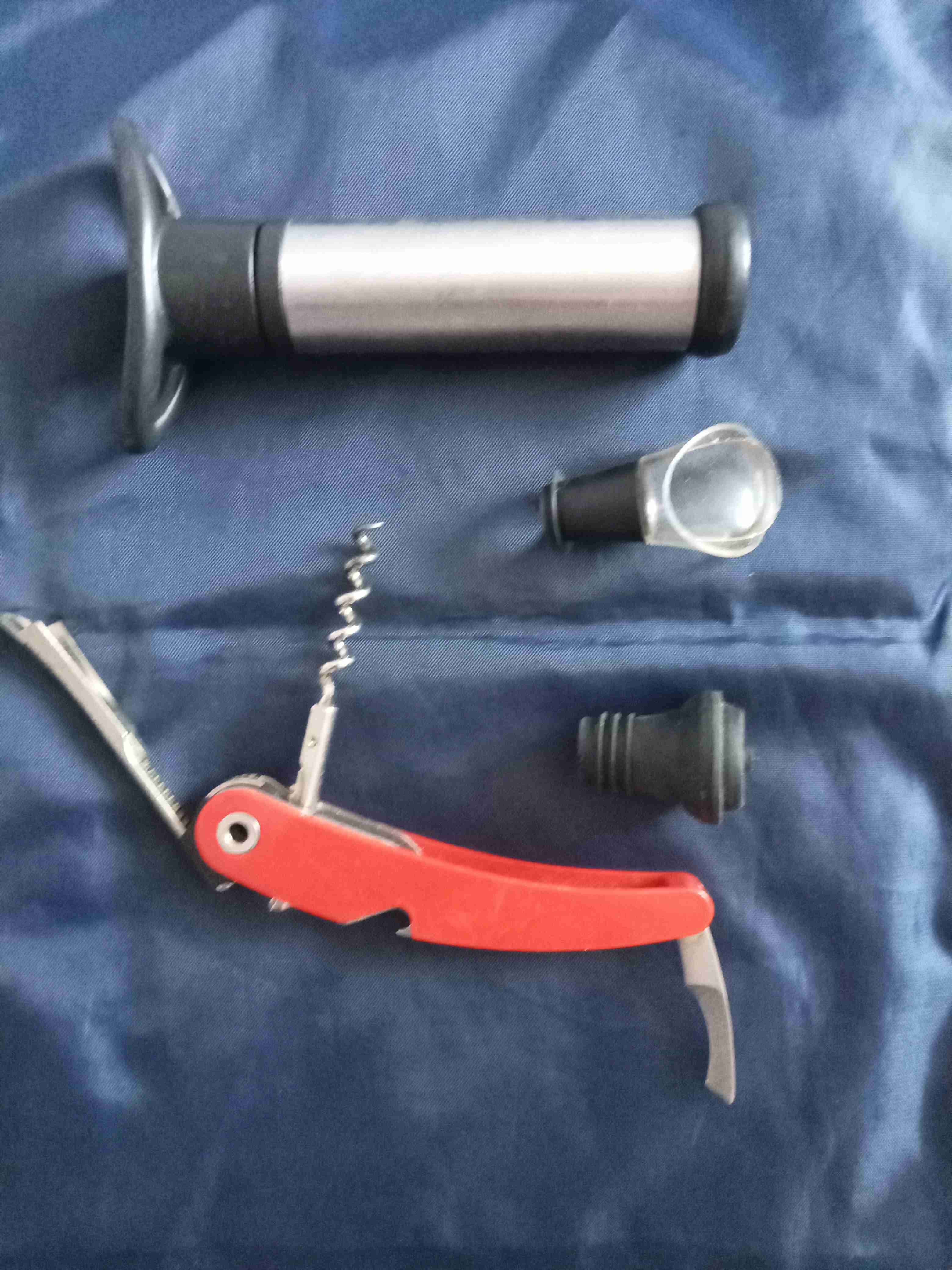 Set de accesorios para vino, incluye abridor y tapones. Ideal para entusiastas del vino.