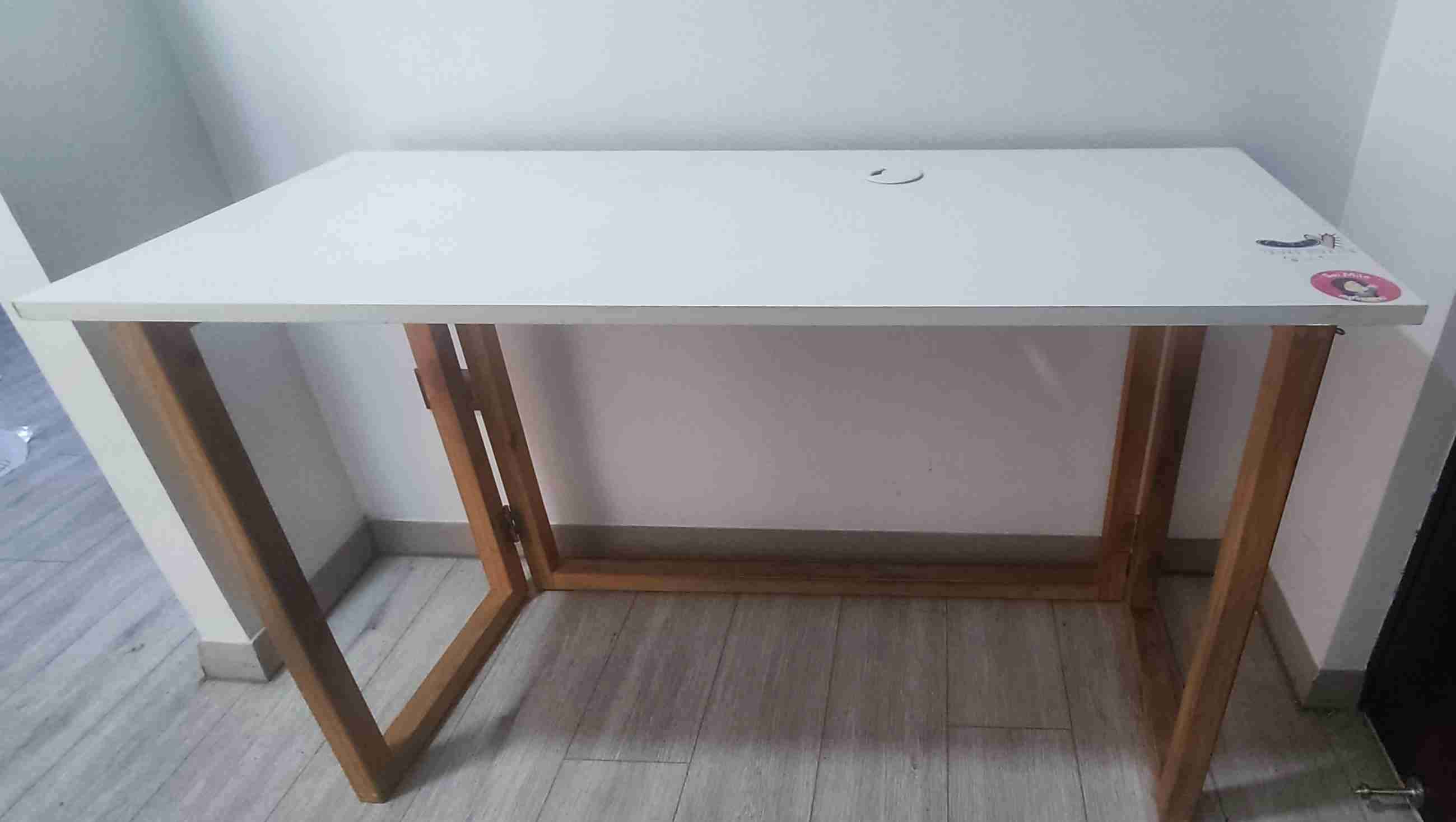 Mesa de madera blanca plegable, ideal para espacios pequeños. Se encuentra en buen estado con detalles menores de uso.