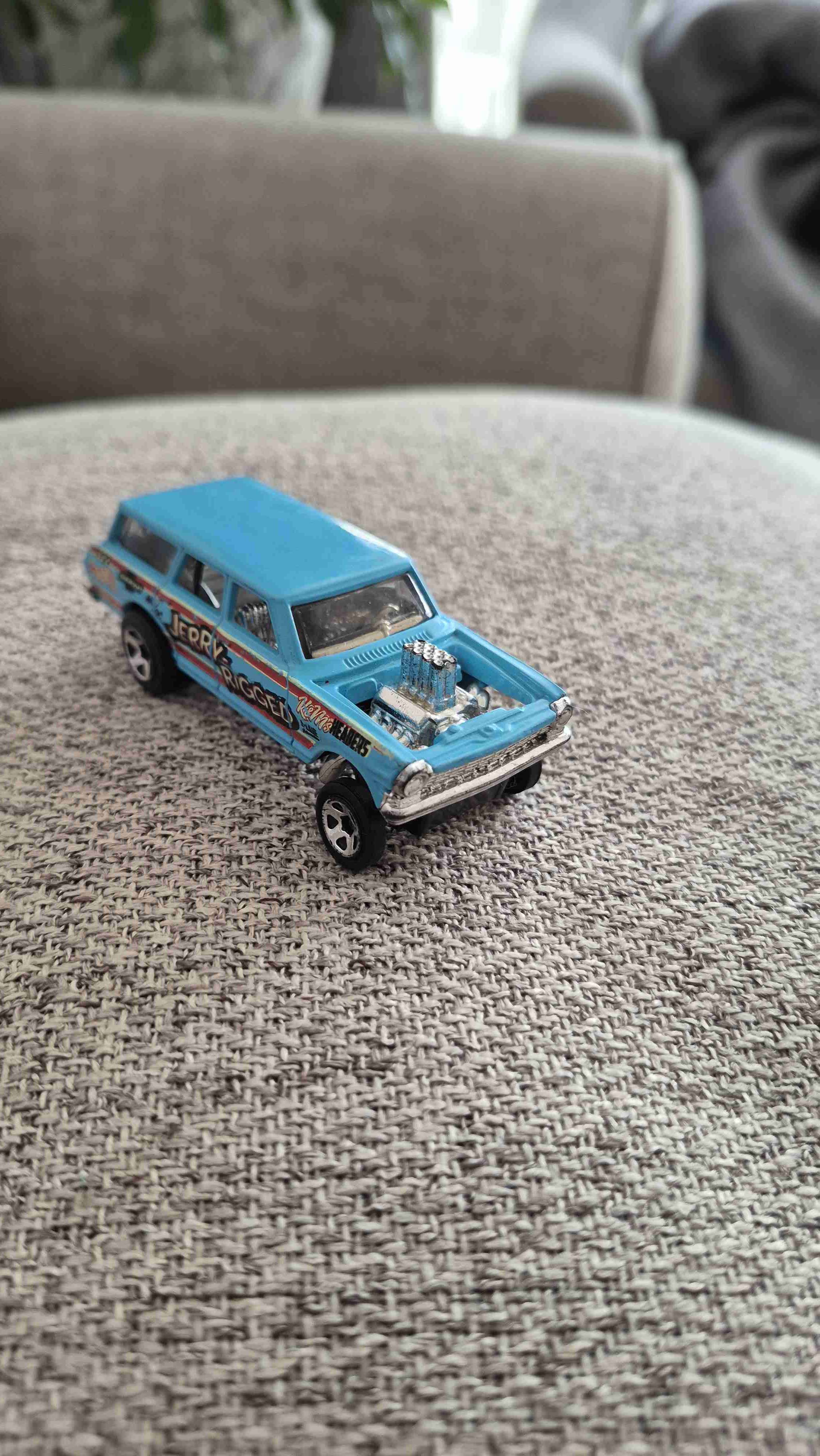 Miniatura de auto azul con diseño llamativo. Ideal para coleccionistas o como juguete. Buen estado con detalles de uso.