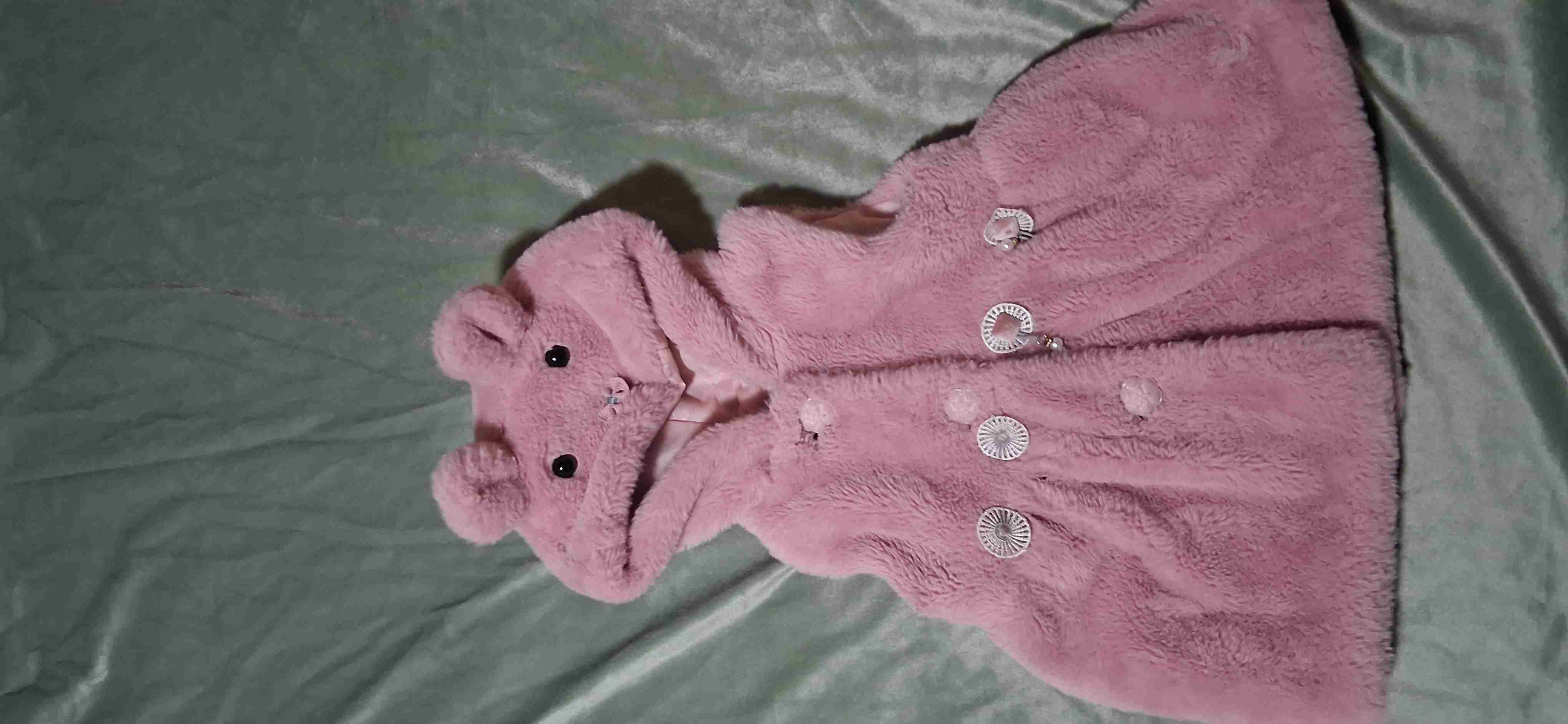 Chaleco para niña de color rosa, tejido peludo y suave. Incluye capucha con orejitas, perfecto para climas fríos. En buen estado general talla 18.