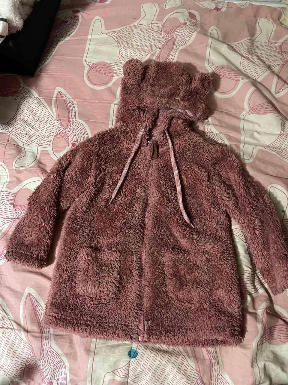 Abrigo de felpa en color marrón, suave y cálido, ideal para niños. Incluye capucha con orejas decorativas. Perfecto para días fríos. Talla 18 meses niña