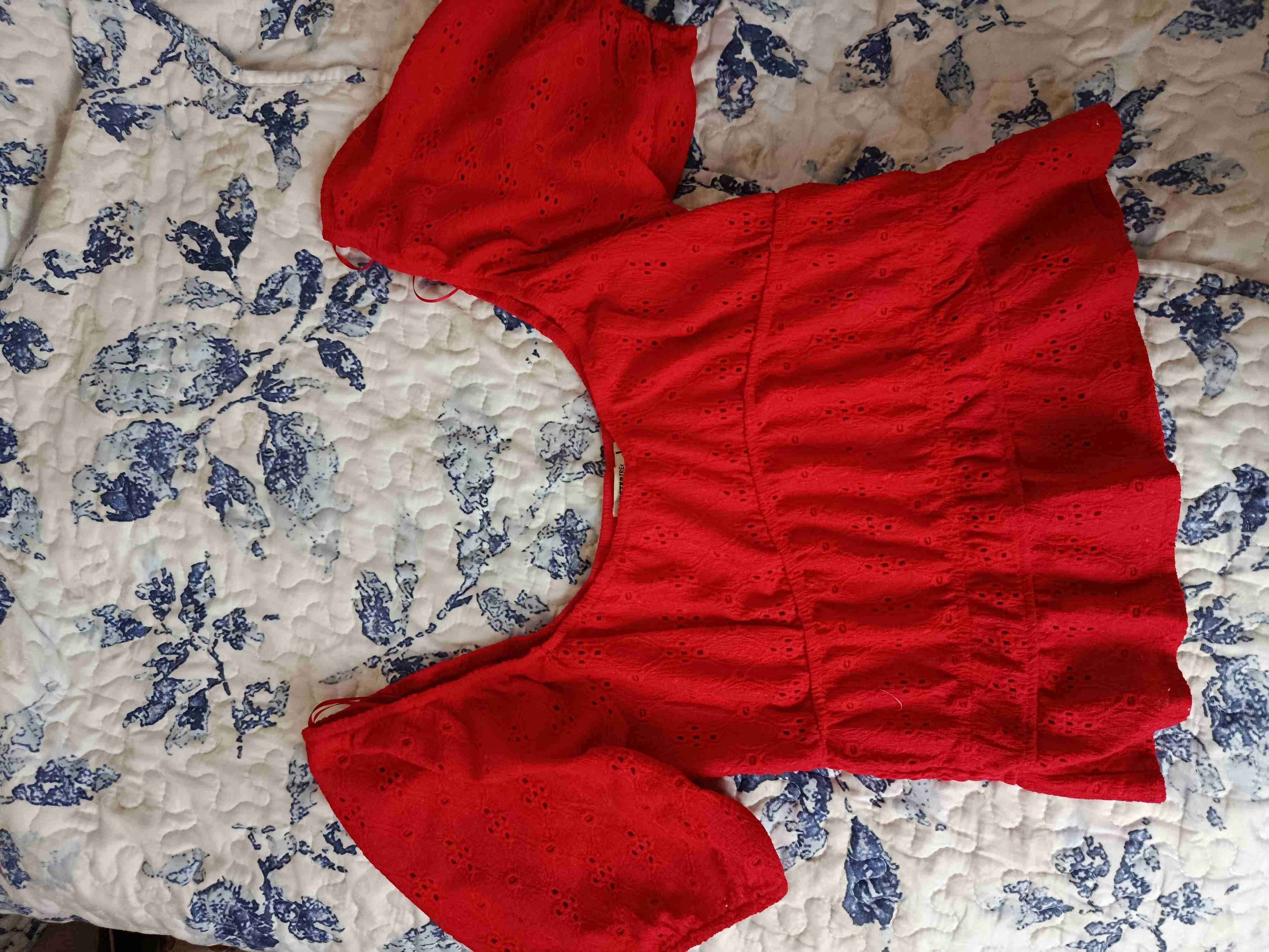 Blusa roja con mangas abullonadas y detalles calados, ideal para ocasiones casuales, un uso