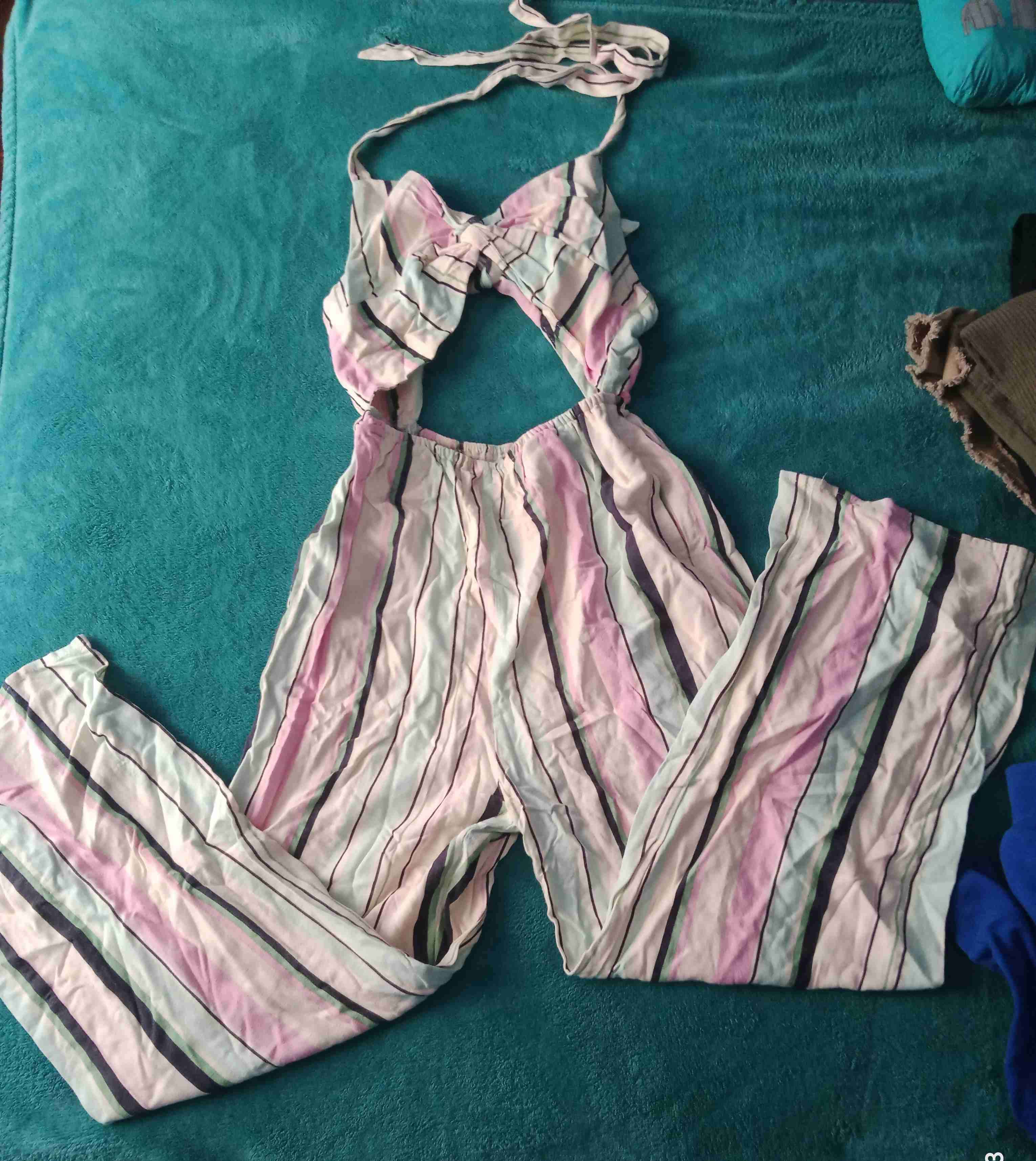 Jumpsuit de rayas en tonos pastel, ideal para el verano. En buen estado y muy cómodo.