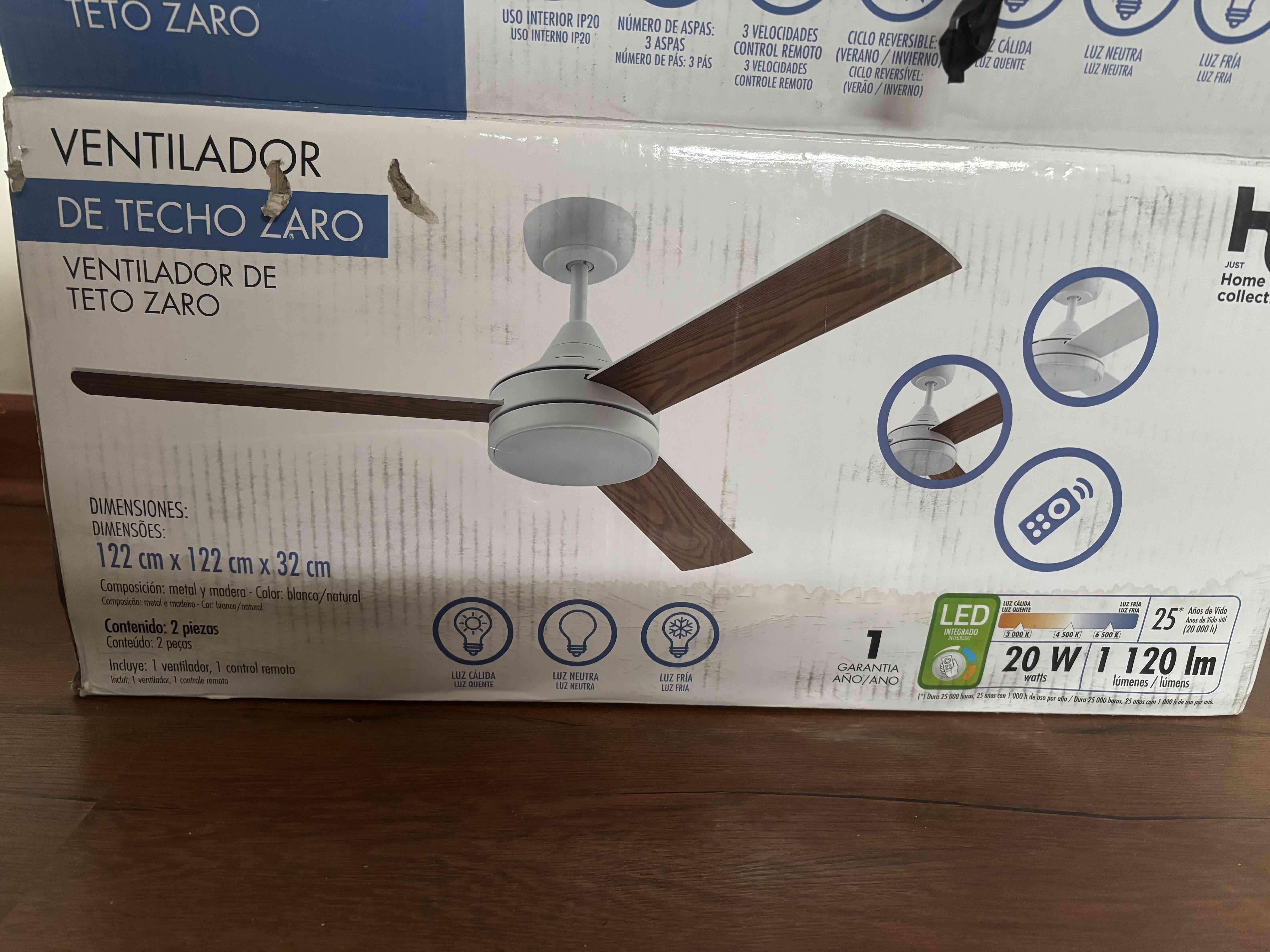 Ventilador de techo con luz LED y control remoto. Ideal para refrescar e iluminar espacios. Nuevo en caja.