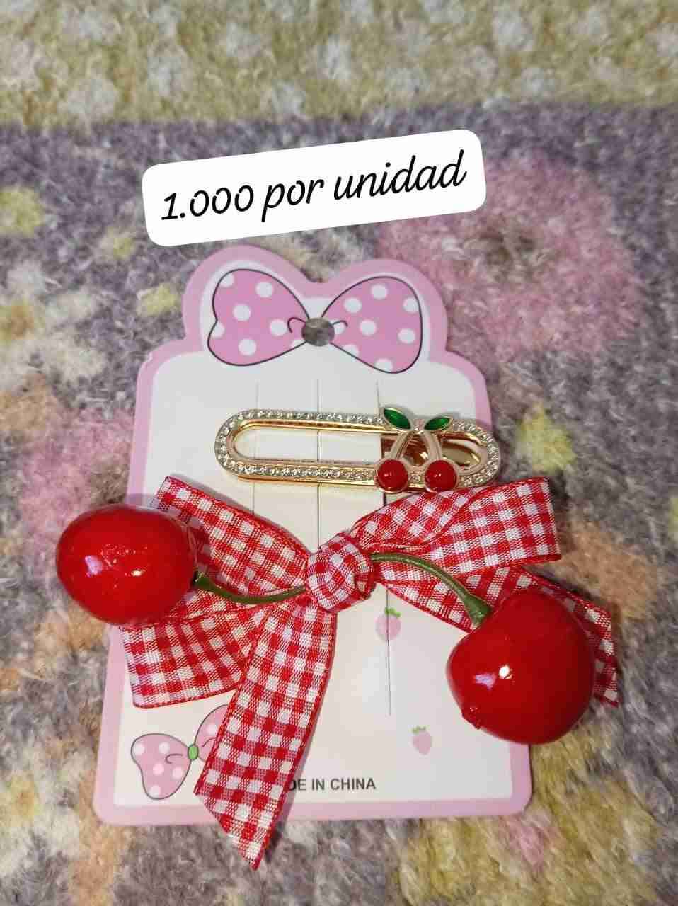 Elegante pinza de pelo con detalle de cerezas y moño rojo, ideal para dar un toque coqueto a tu peinado. En buen estado, perfecta para uso diario.