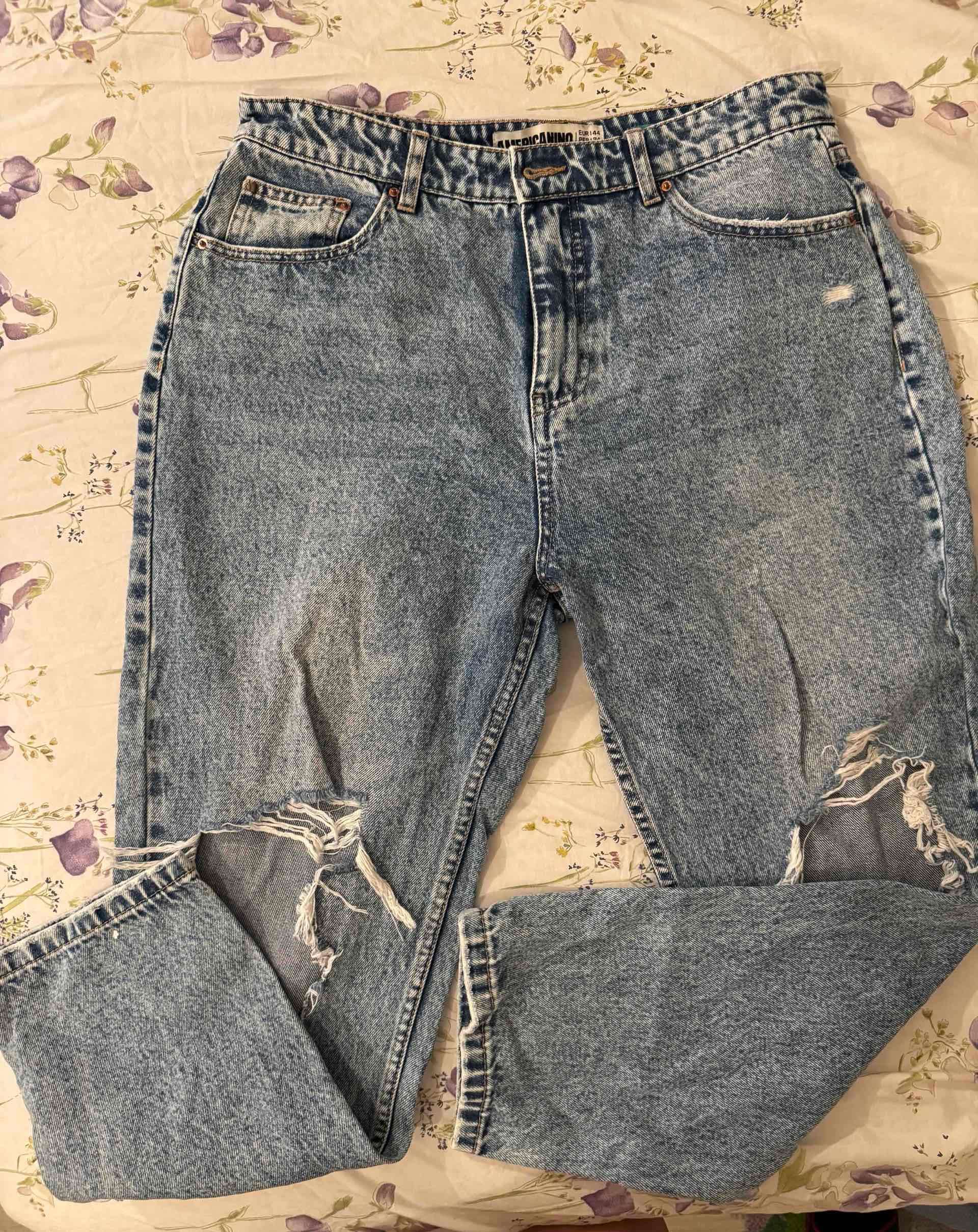 Jeans clásicos de mezclilla azul con detalles desgastados.