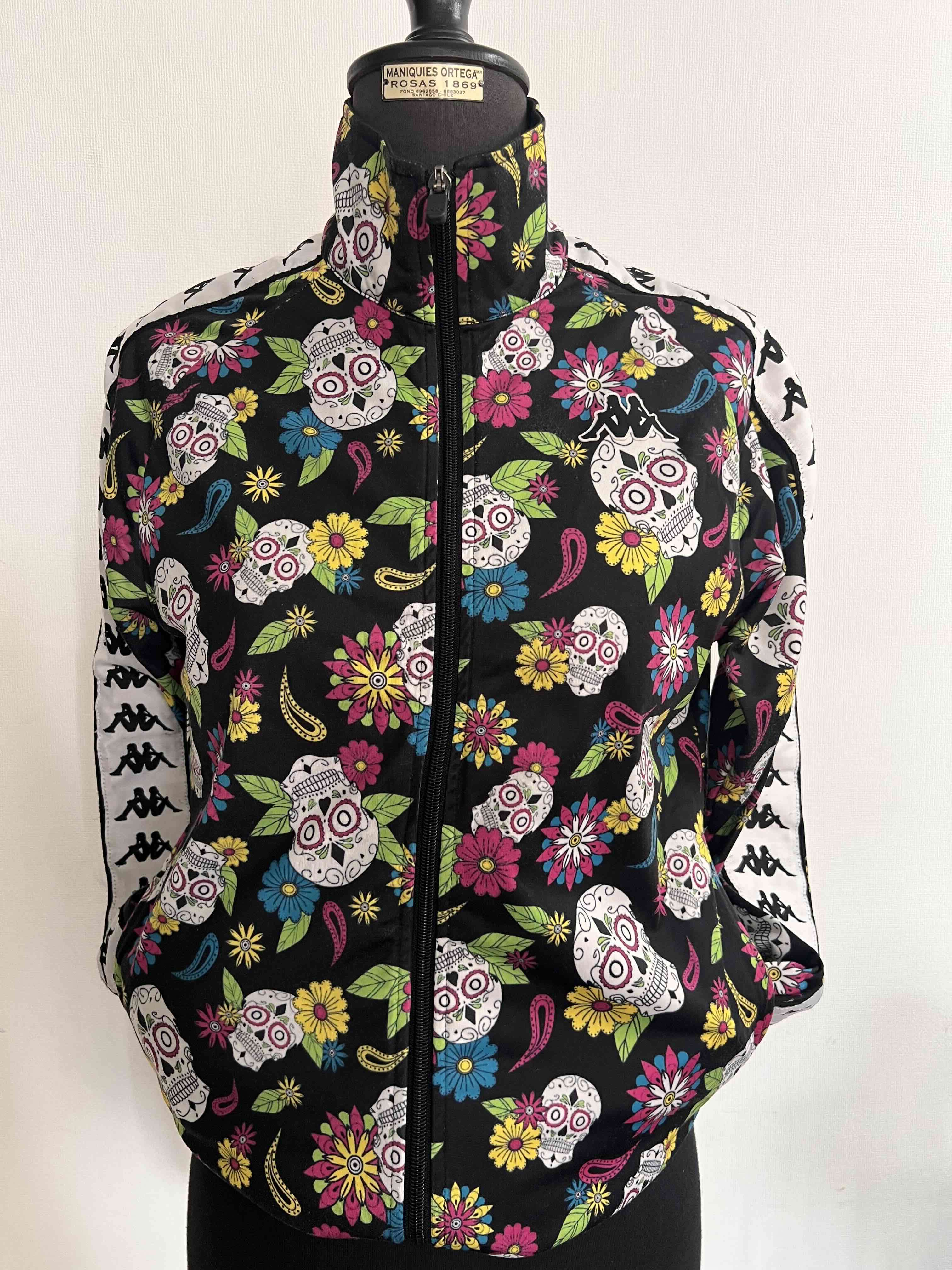Chaqueta negra con estampado de calaveras y flores, estilo único y vibrante. Perfecta para un look casual. Buen estado general.