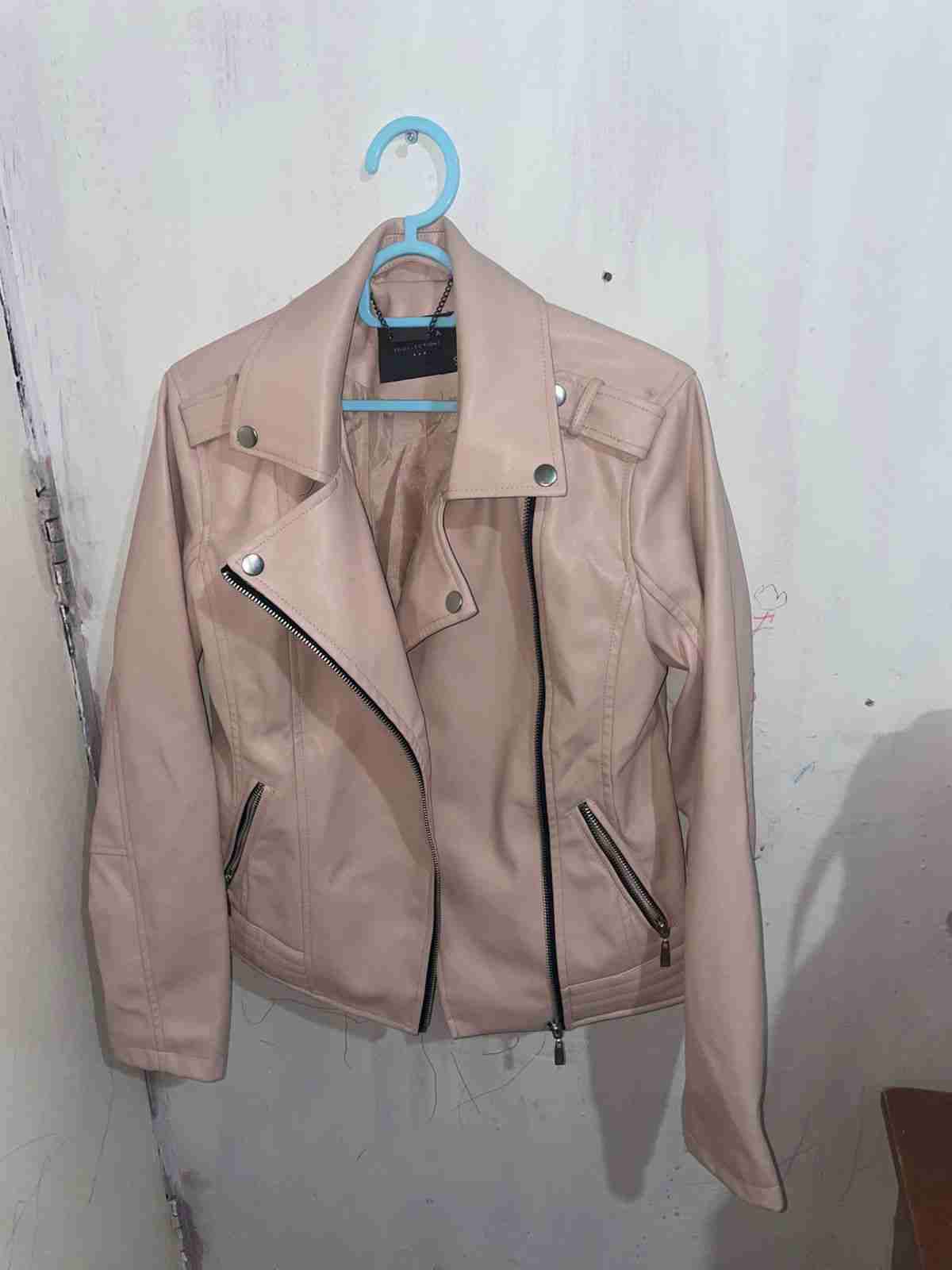 Chaqueta estilo motociclista para mujer en color beige. Perfecta para uso diario o casual, con cierre asimétrico y bolsillos con cremallera.