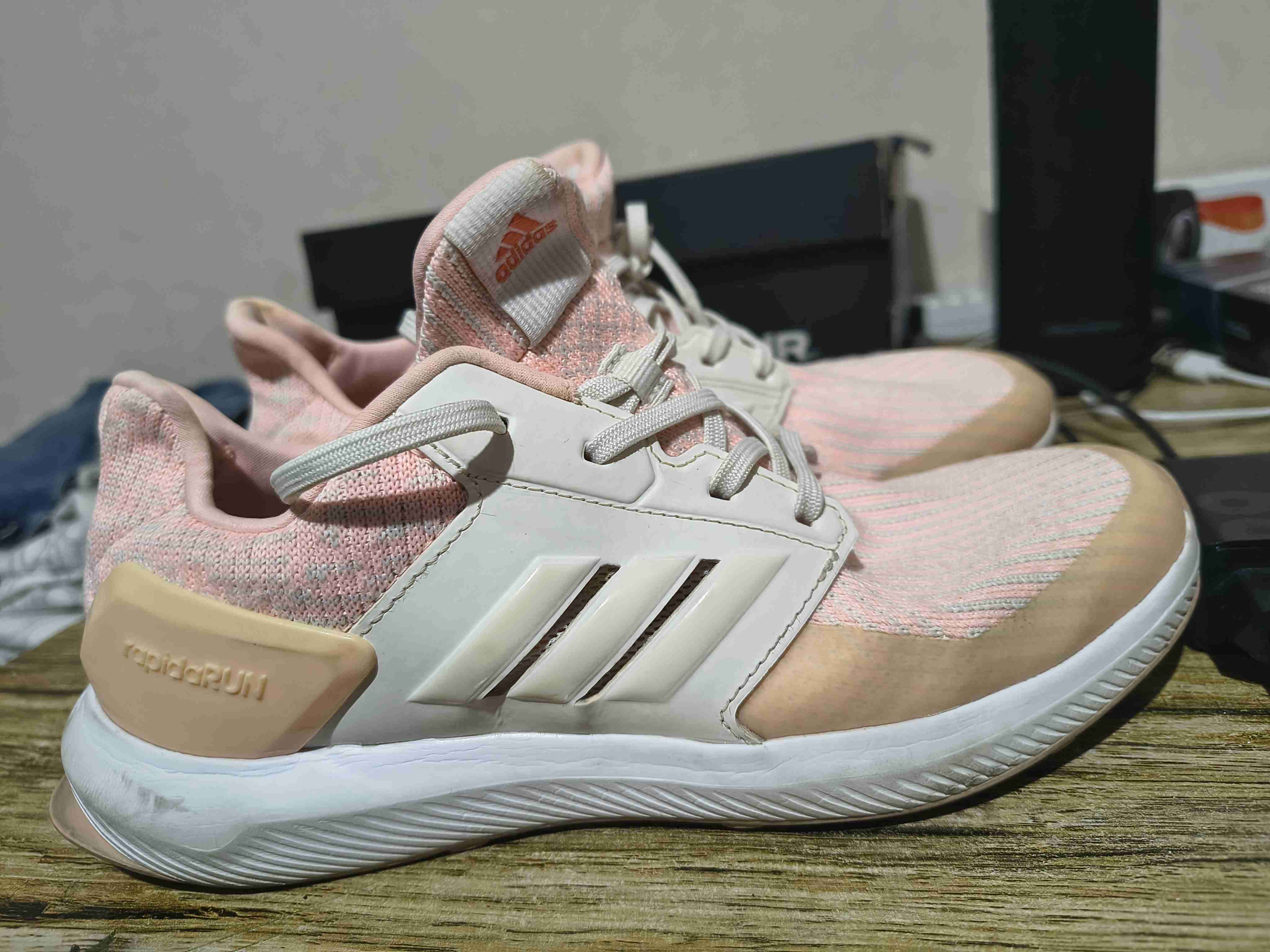Zapatillas Adidas para running en tonos rosados, en buen estado general. Ideales para entrenamientos.
