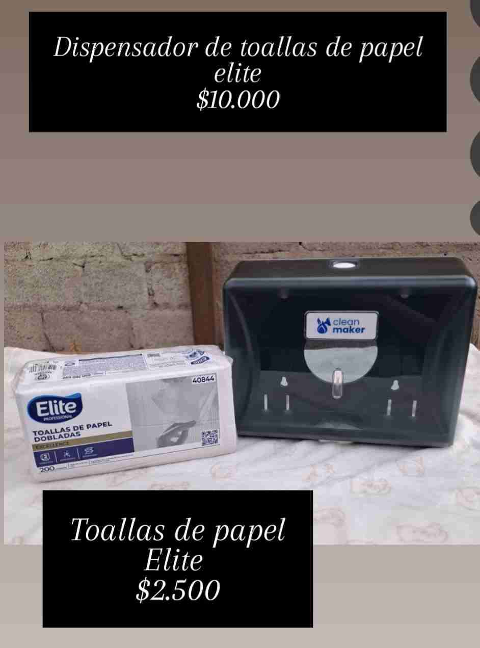 Dispensador de toallas de papel marca Elite, ideal para baños o cocinas. Incluye paquete de toallas. Estado general bueno.