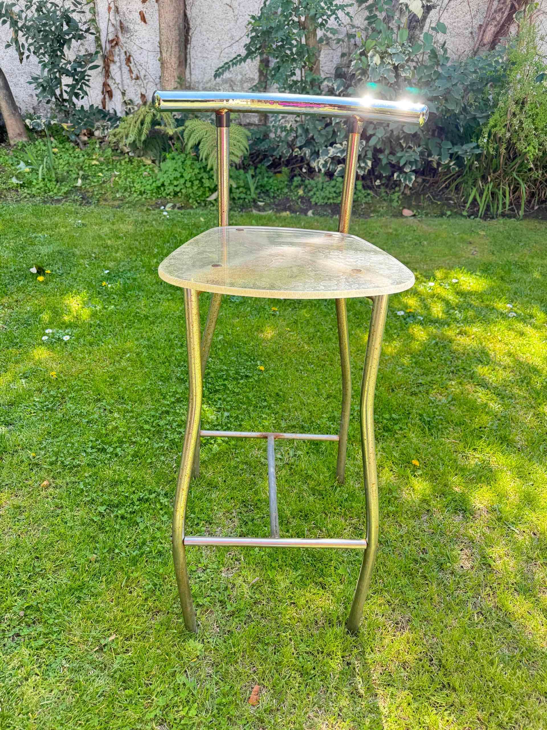 Silla alta de metal en color plateado, ideal para jardín o terraza. Buen estado general.tengo 4
