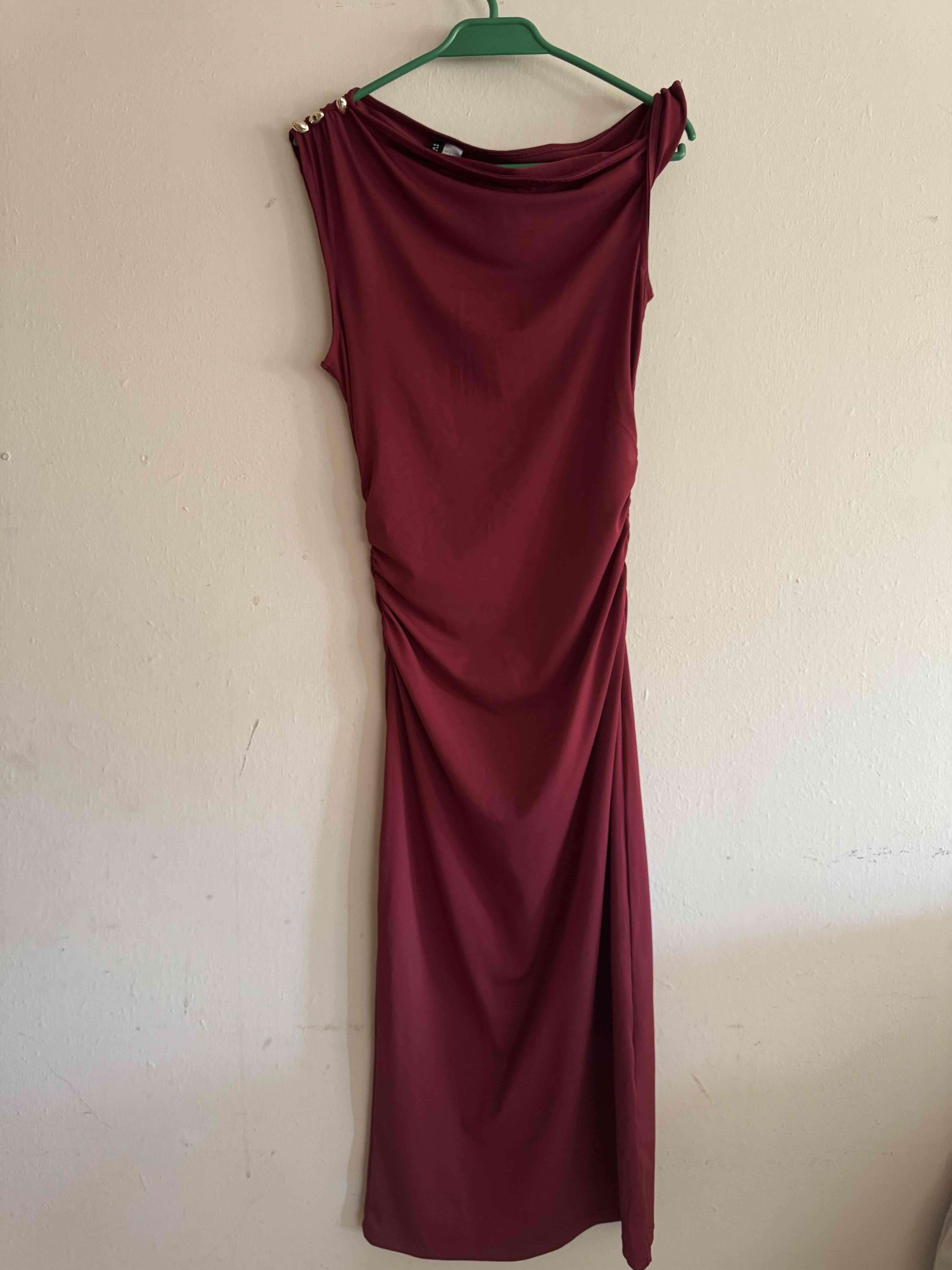 Vestido rojo estilo elegante, perfecto para ocasiones especiales. En buen estado, con detalles de botones dorados en el hombro.