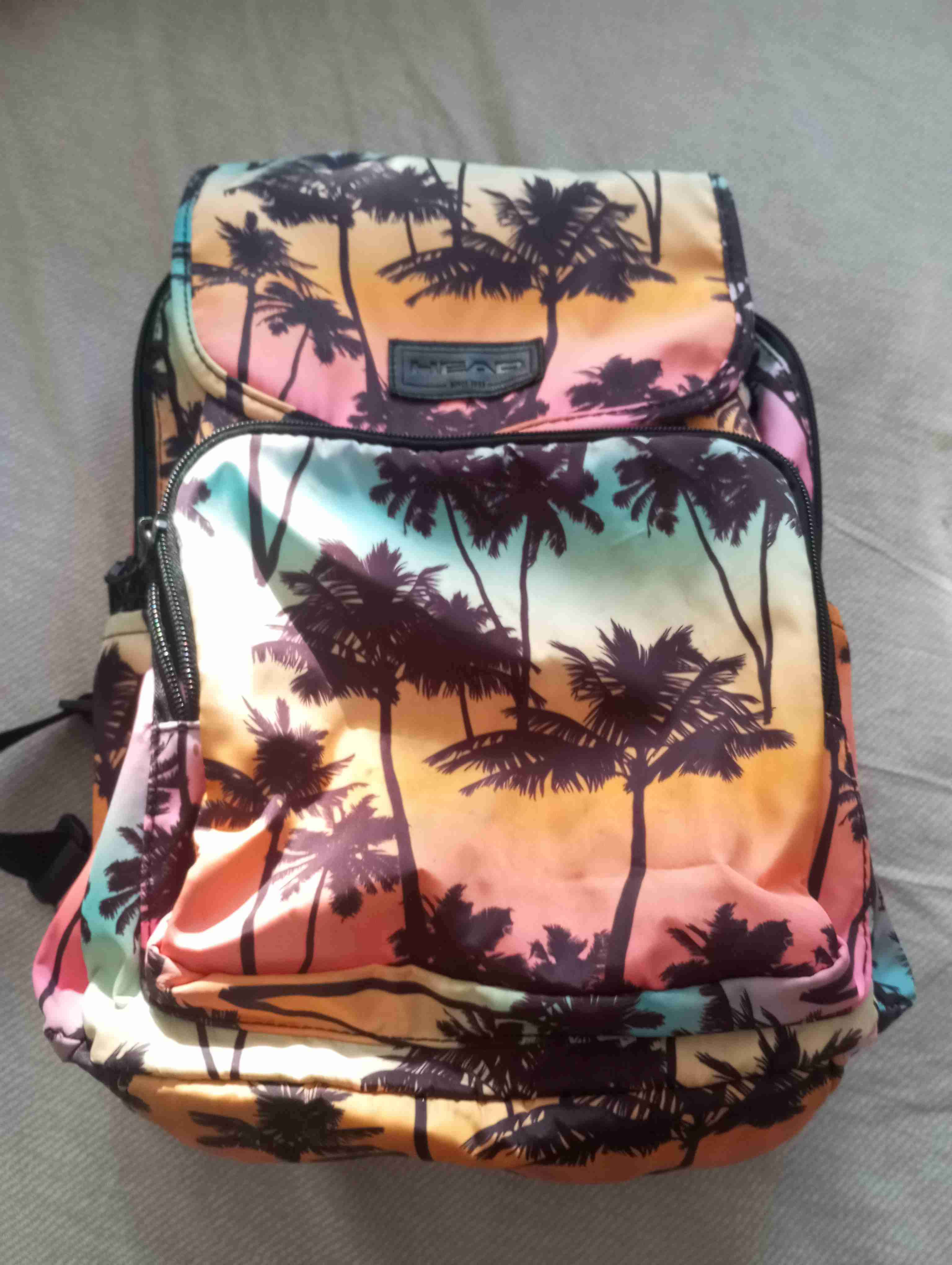 Mochila con diseño de palmeras al atardecer, ideal para el día a día. Se encuentra en buen estado general.