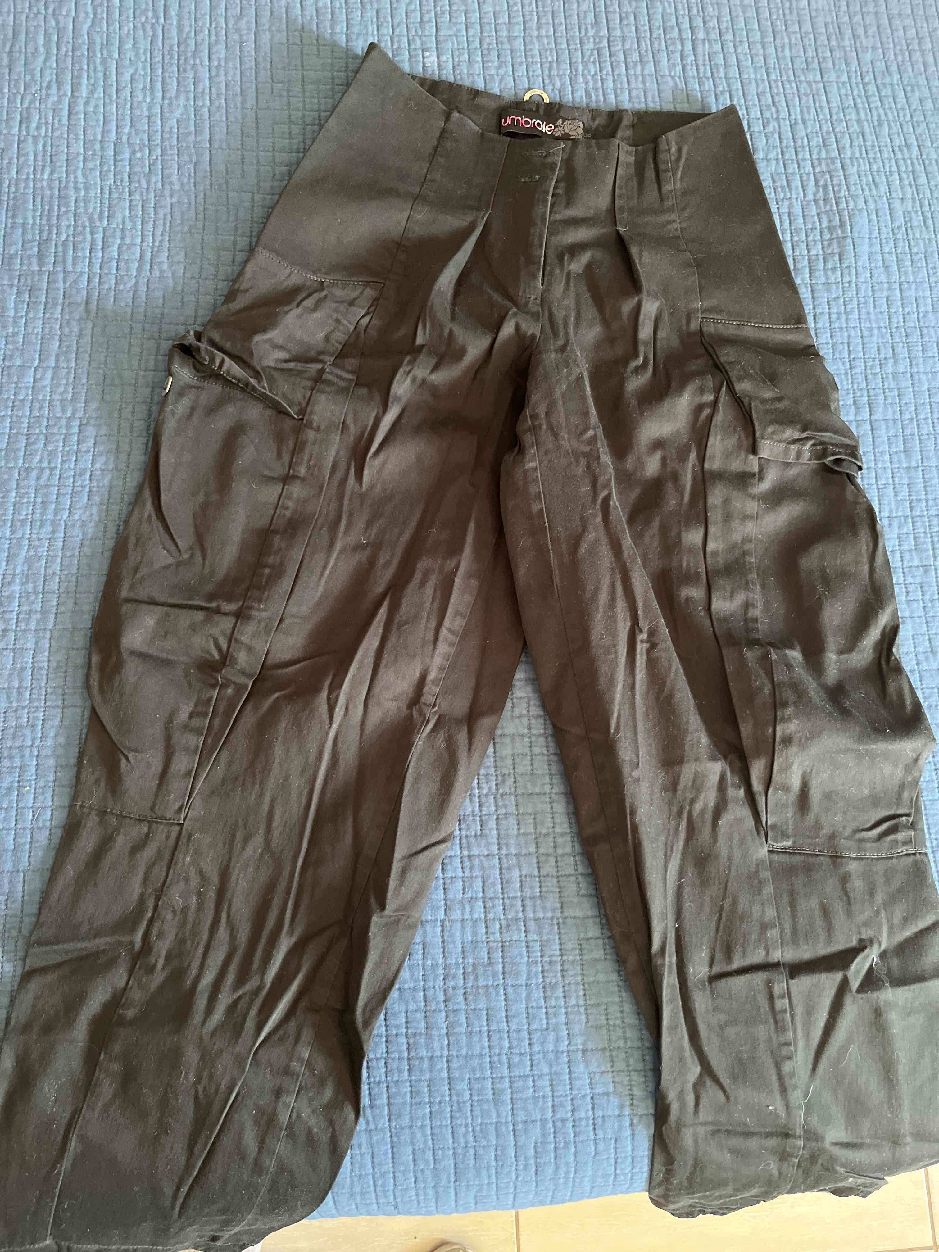 Pantalones cargo color negro, ideales para un look casual. En buen estado con bolsillos laterales prácticos.