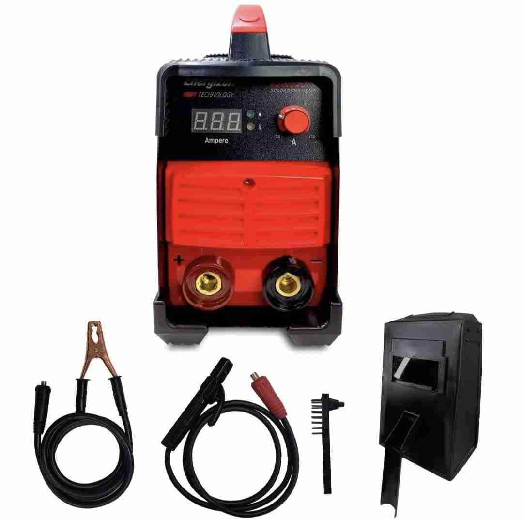 Equipo de soldadura inversora portátil, ideal para trabajos en el hogar y pequeños talleres. Incluye máscara de protección y cables.