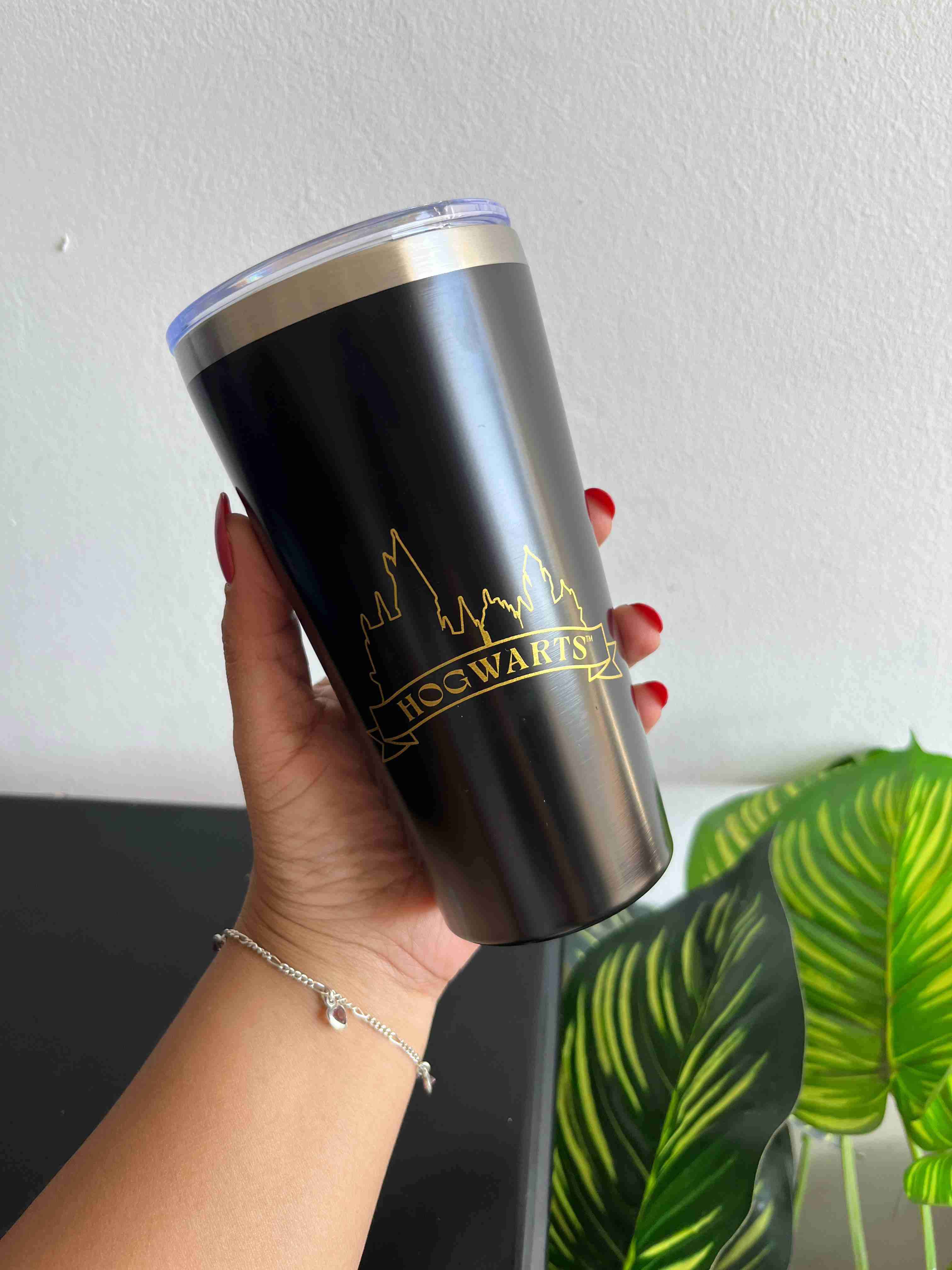 Vaso térmico negro con diseño de Hogwarts. Ideal para mantener tus bebidas a la temperatura perfecta. En buen estado.