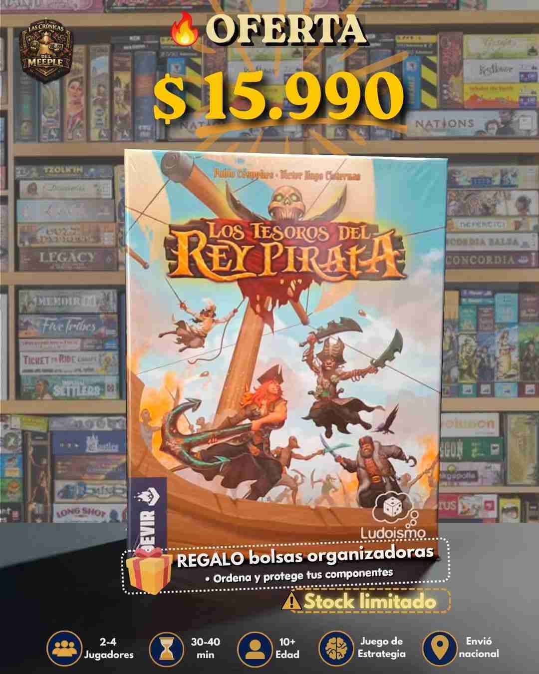 Juego de estrategia para 2-4 jugadores. Explora y se el mejor rey pirata. Incluye bolsas organizadoras de regalo.