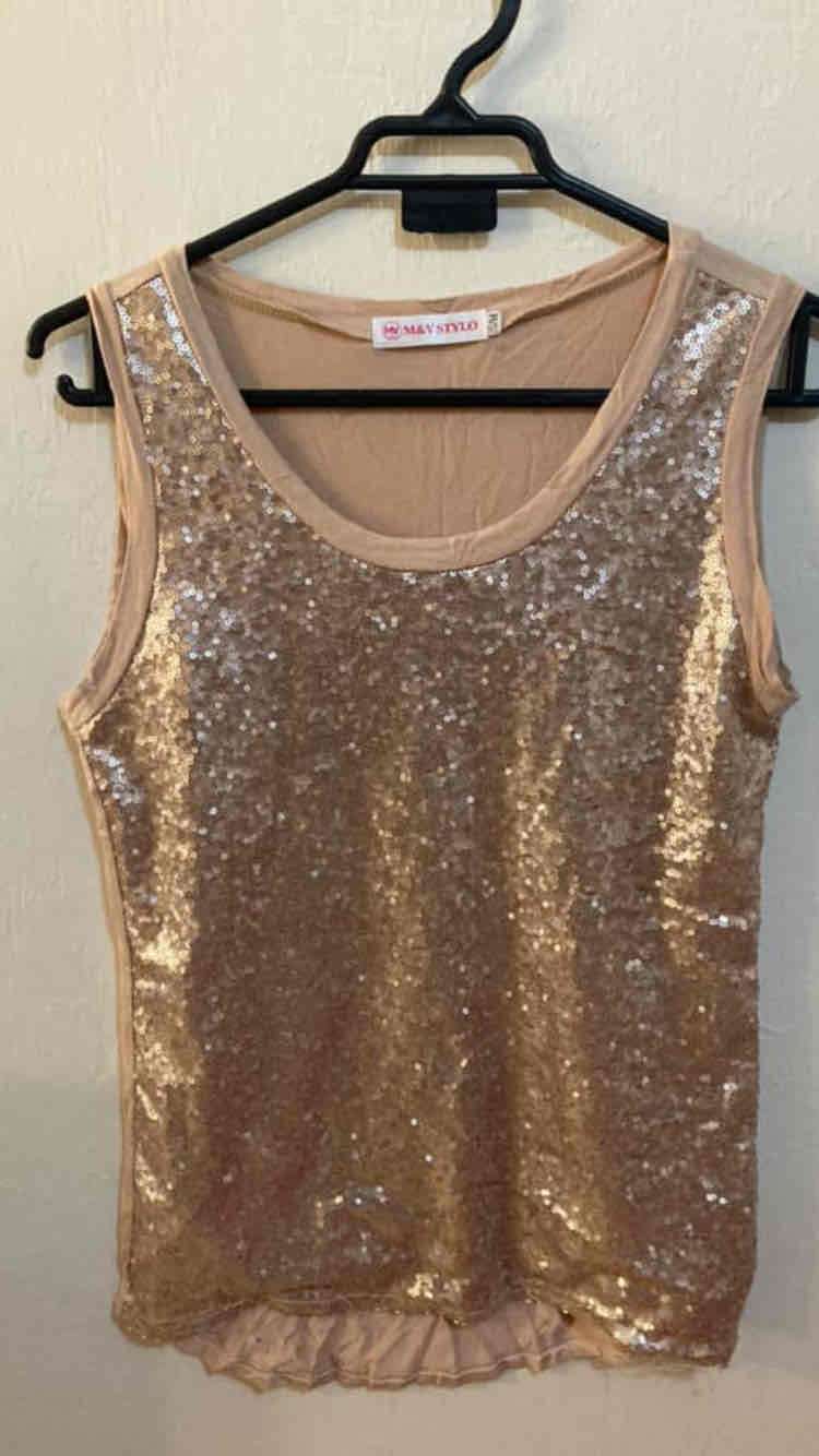 Linda polera sin mangas con lentejuelas doradas, ideal para eventos o salidas nocturnas. En buen estado general.