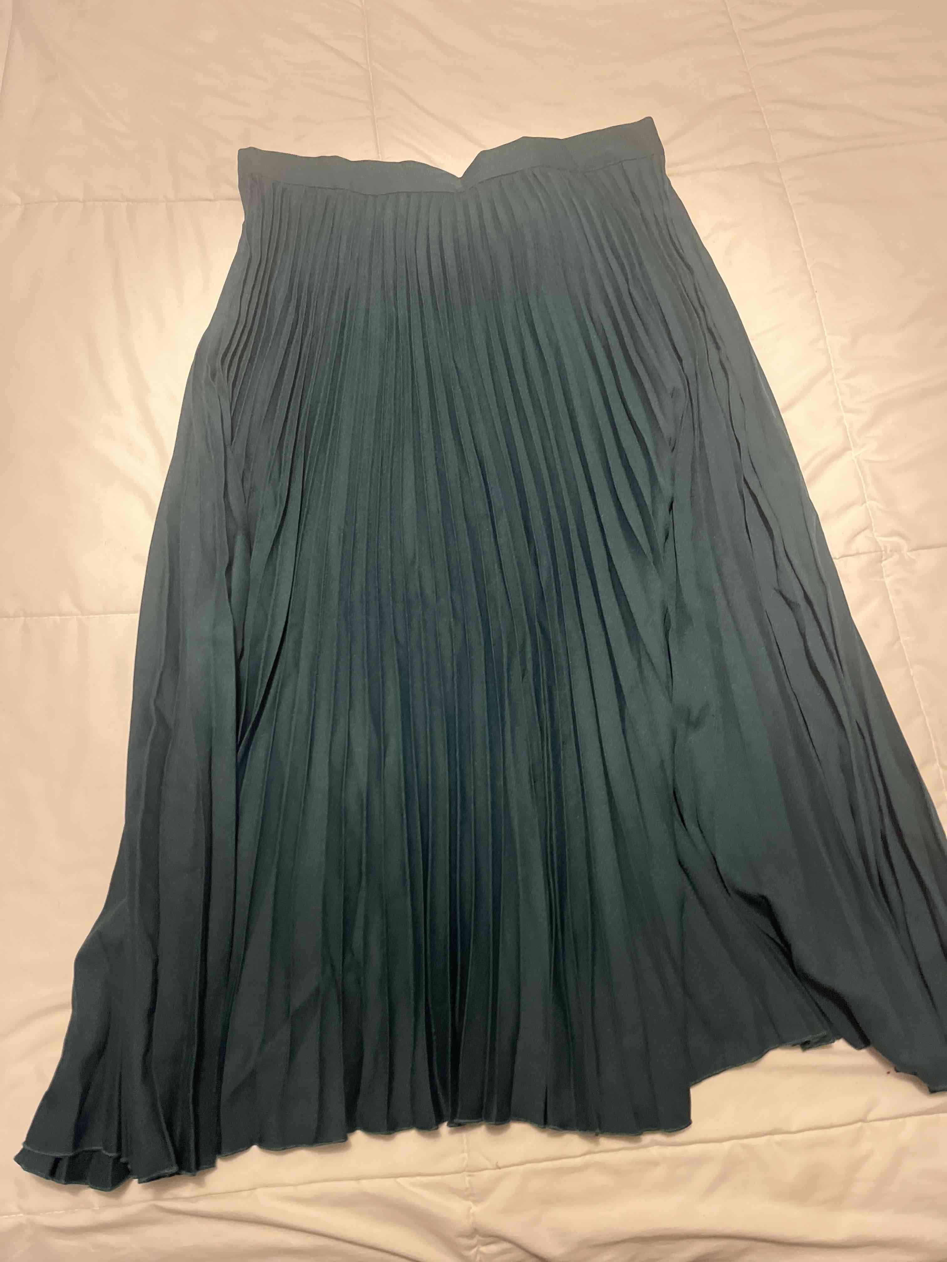 Falda plisada en tono verde oscuro. Ideal para ocasiones formales o casuales. Buen estado con pequeños signos de uso.