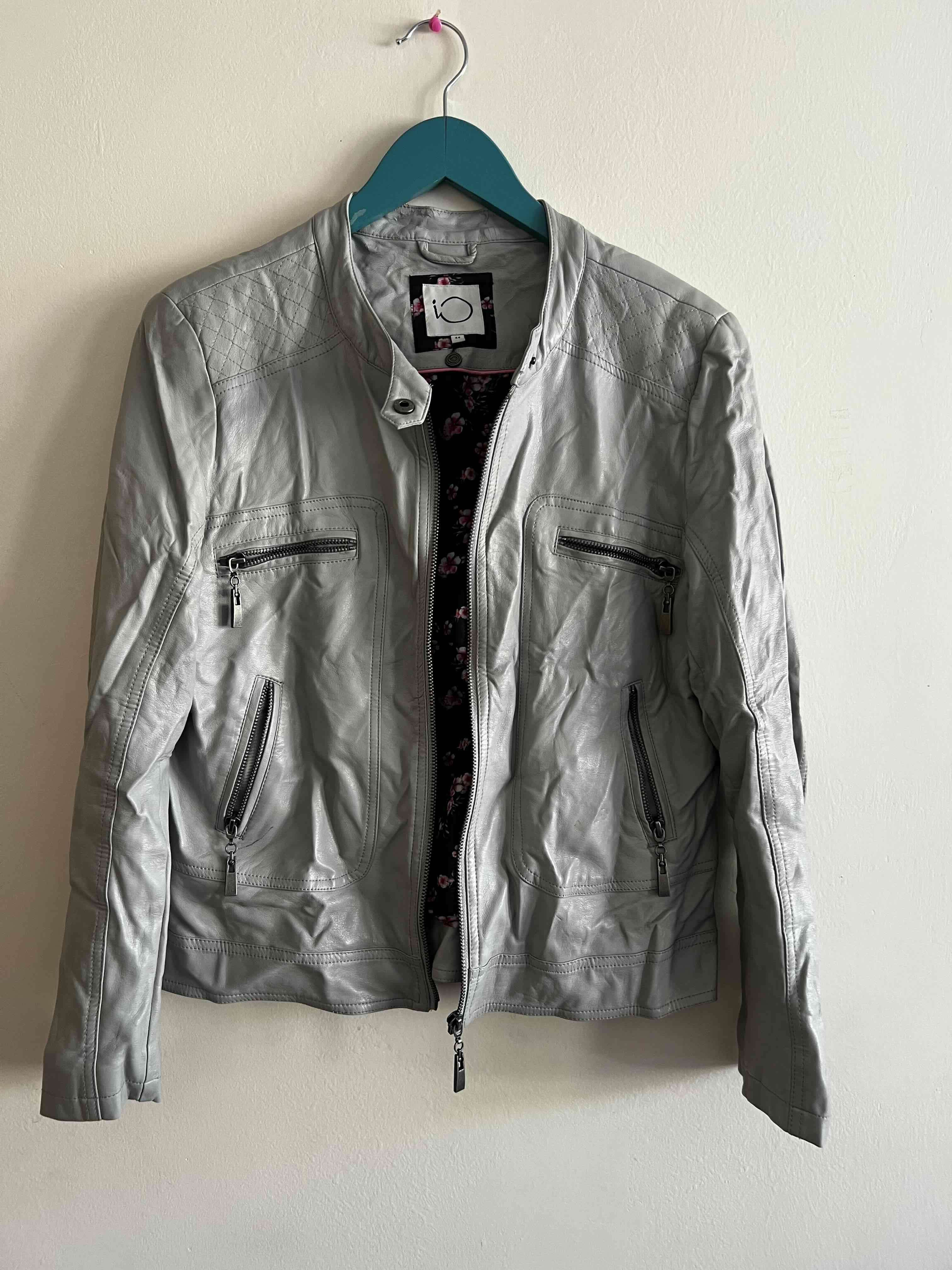 Chaqueta gris elegante con cierre frontal y bolsillos. Ideal para días frescos, en buen estado.detalles en cuello
