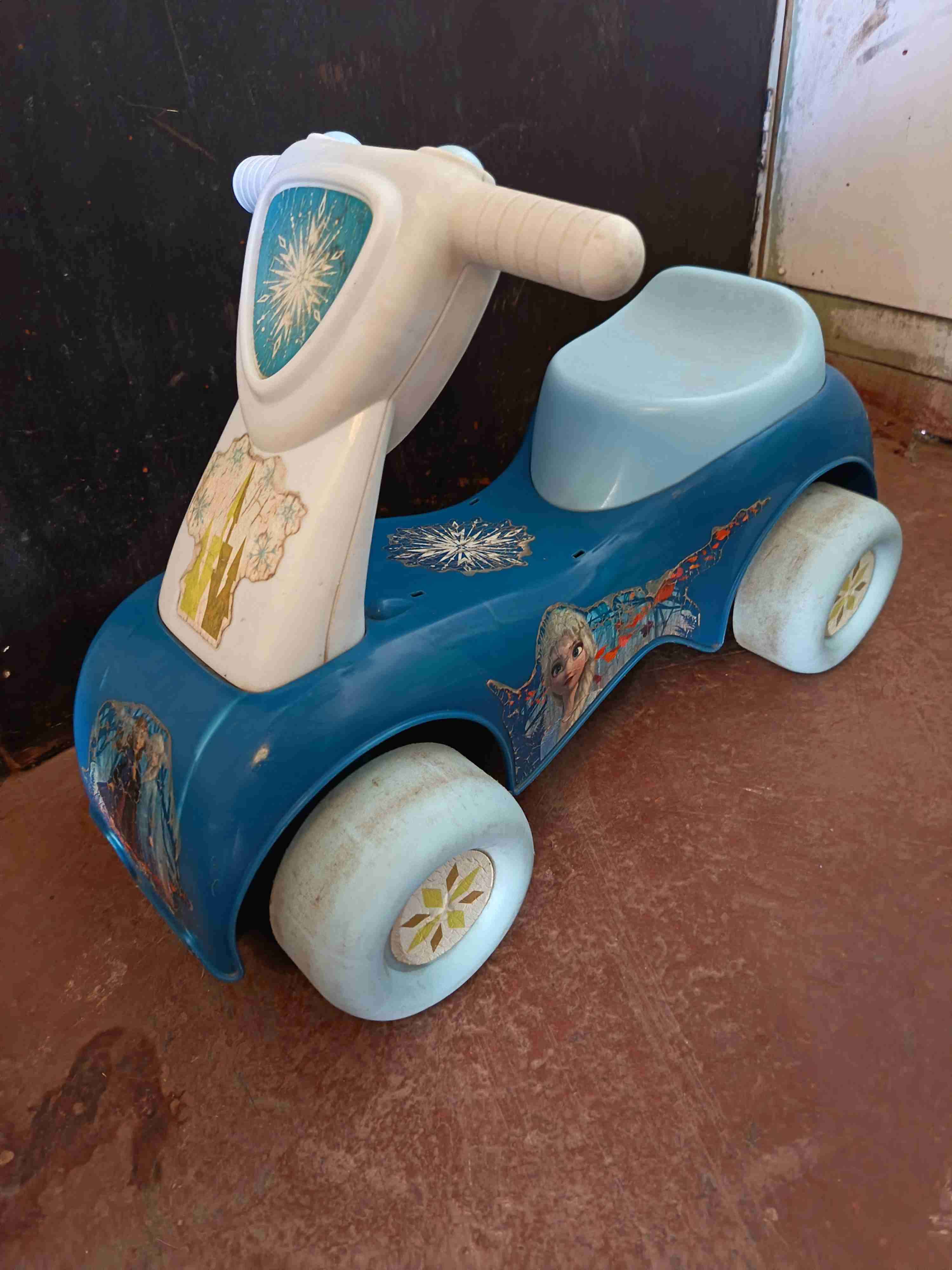 Moto de plástico para niños con diseño de Frozen. Buen estado general, ideal para juegos al aire libre. Con sonido