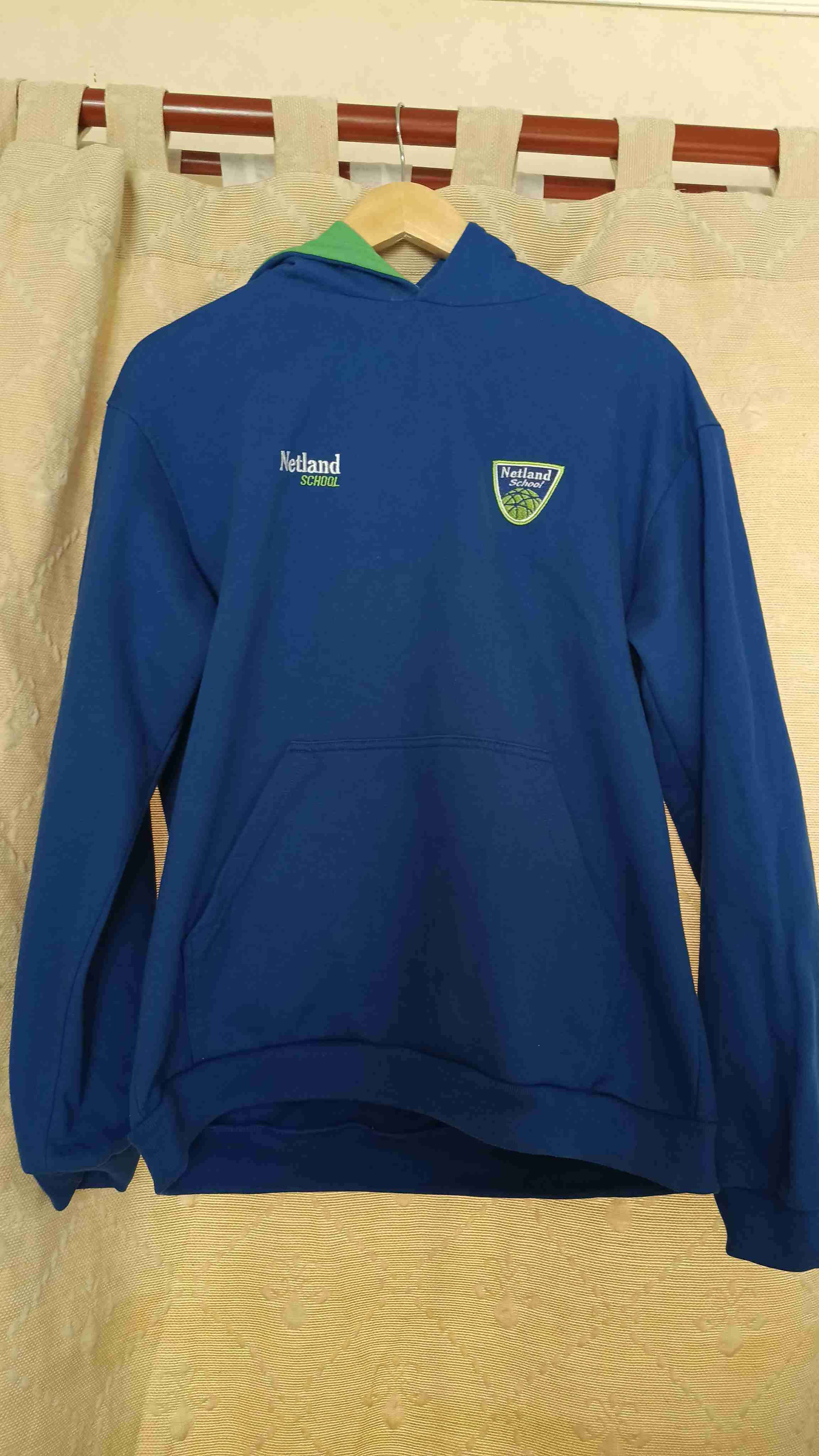 Polerón azul con capucha del colegio Netland. En buen estado, ideal para el invierno.