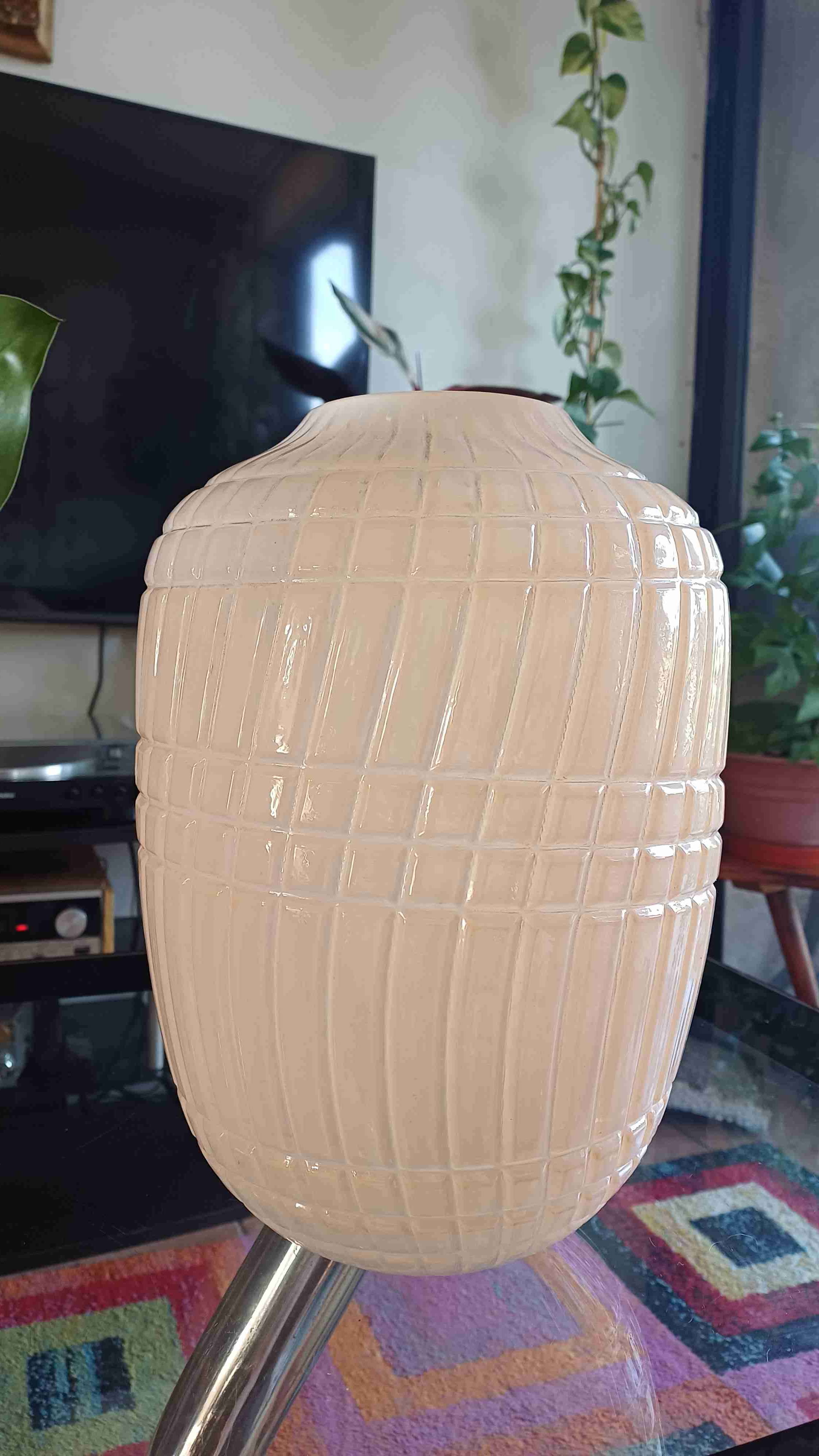 Elegante florero de vidrio en color beige con diseño texturizado, perfecta para decoración moderna. En buen estado.