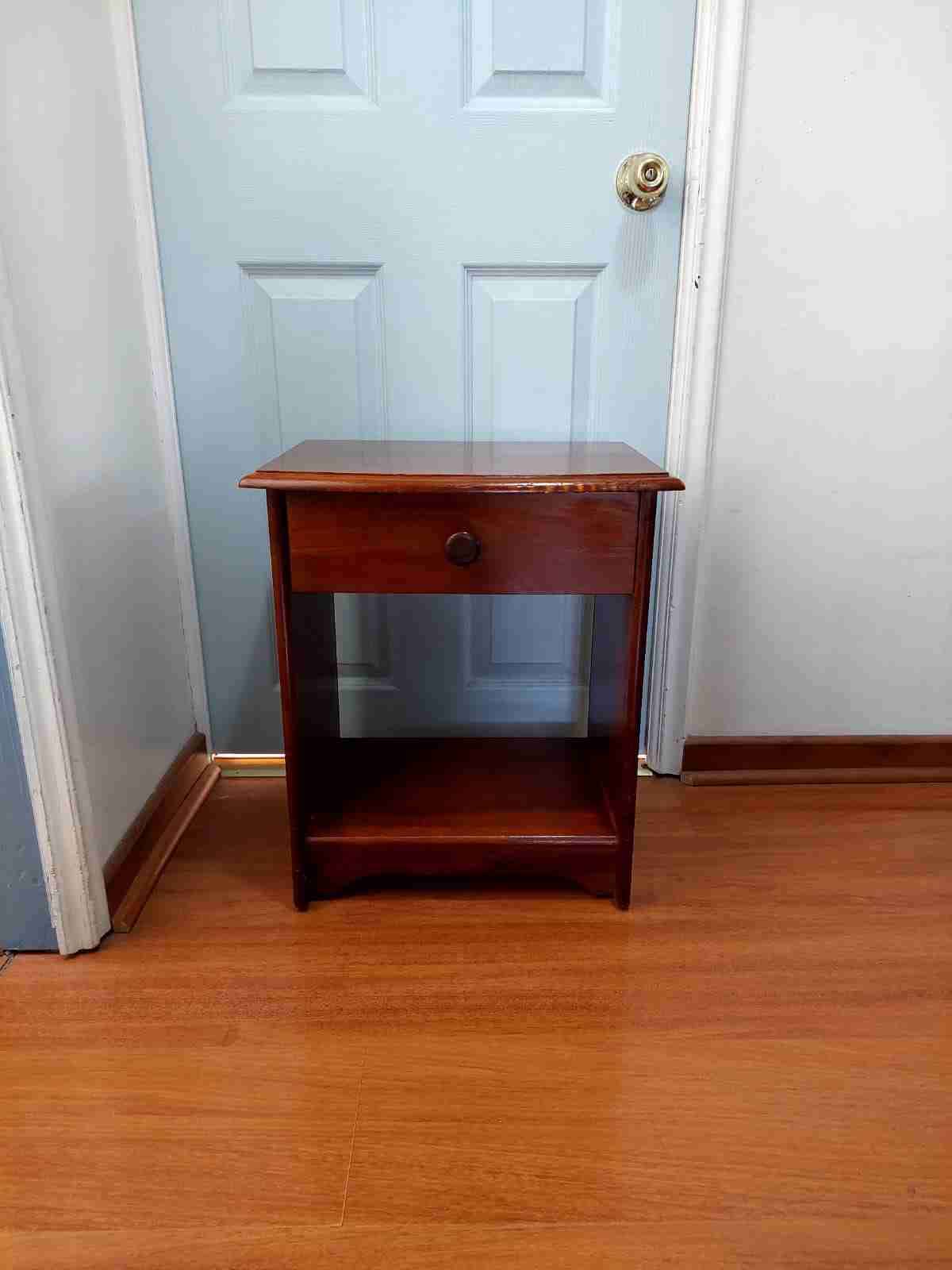 Velador con un cajón y compartimento abierto. Ideal para dormitorio o sala de estar. Buen estado general.