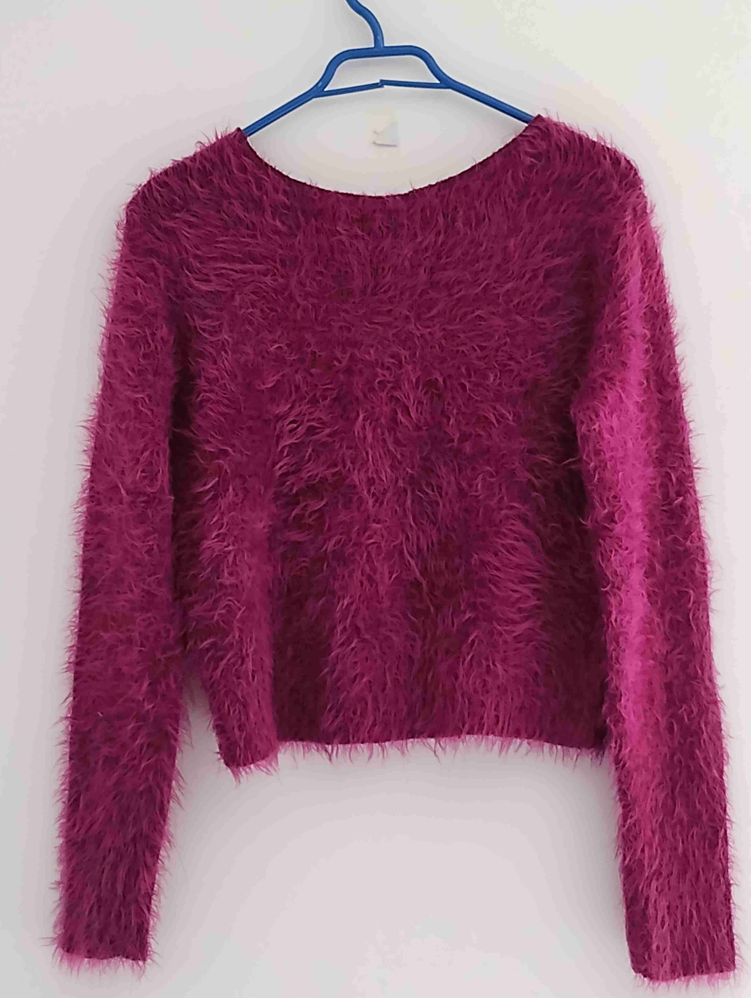 Suéter de color fucsia con textura peluda, ideal para temporadas frías. En buen estado, perfecto para un look casual y abrigado.