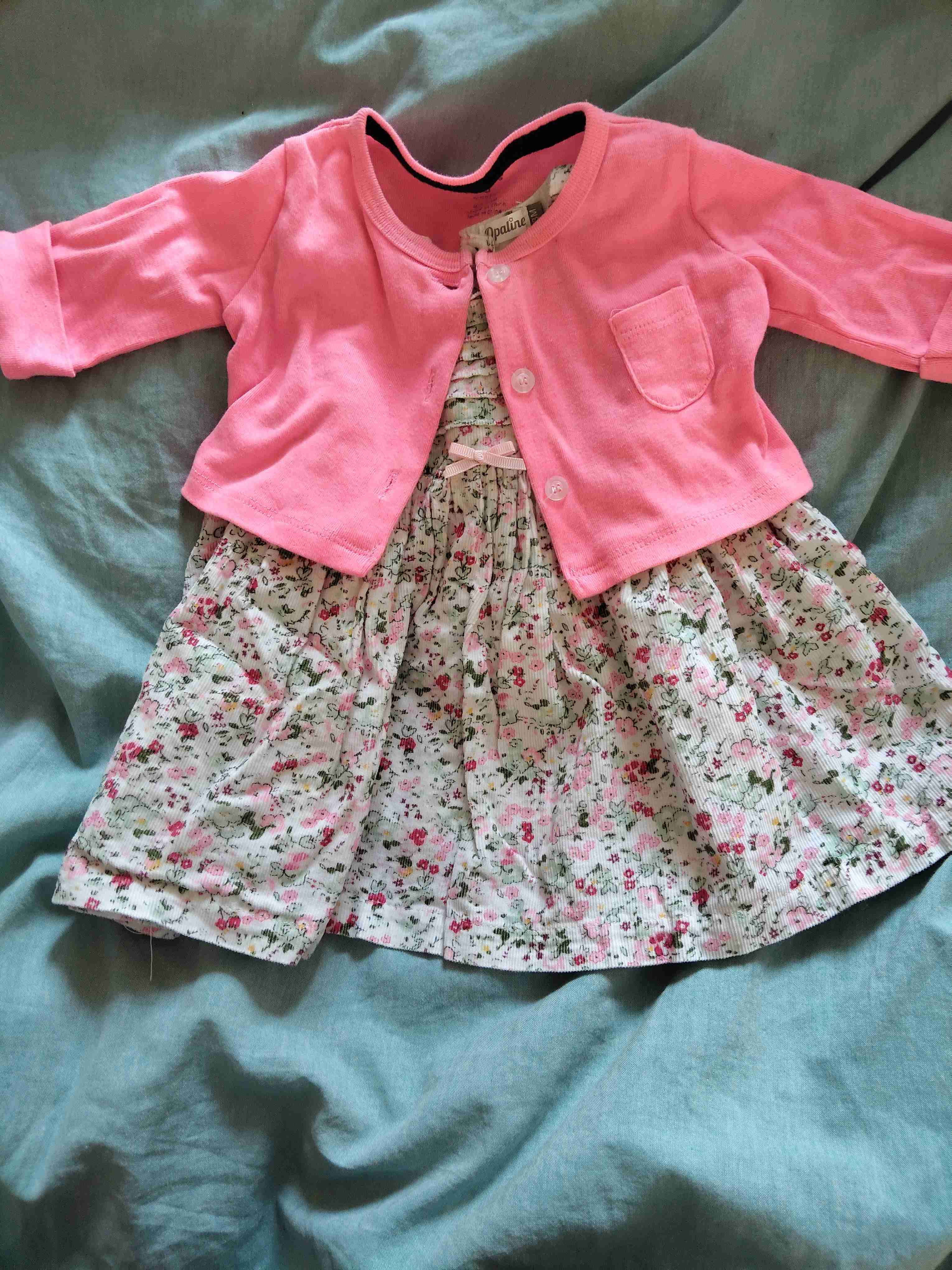 Hermoso vestido de flores con chaqueta rosada, ideal para ocasiones especiales o uso diario. Buen estado, con detalles delicados.