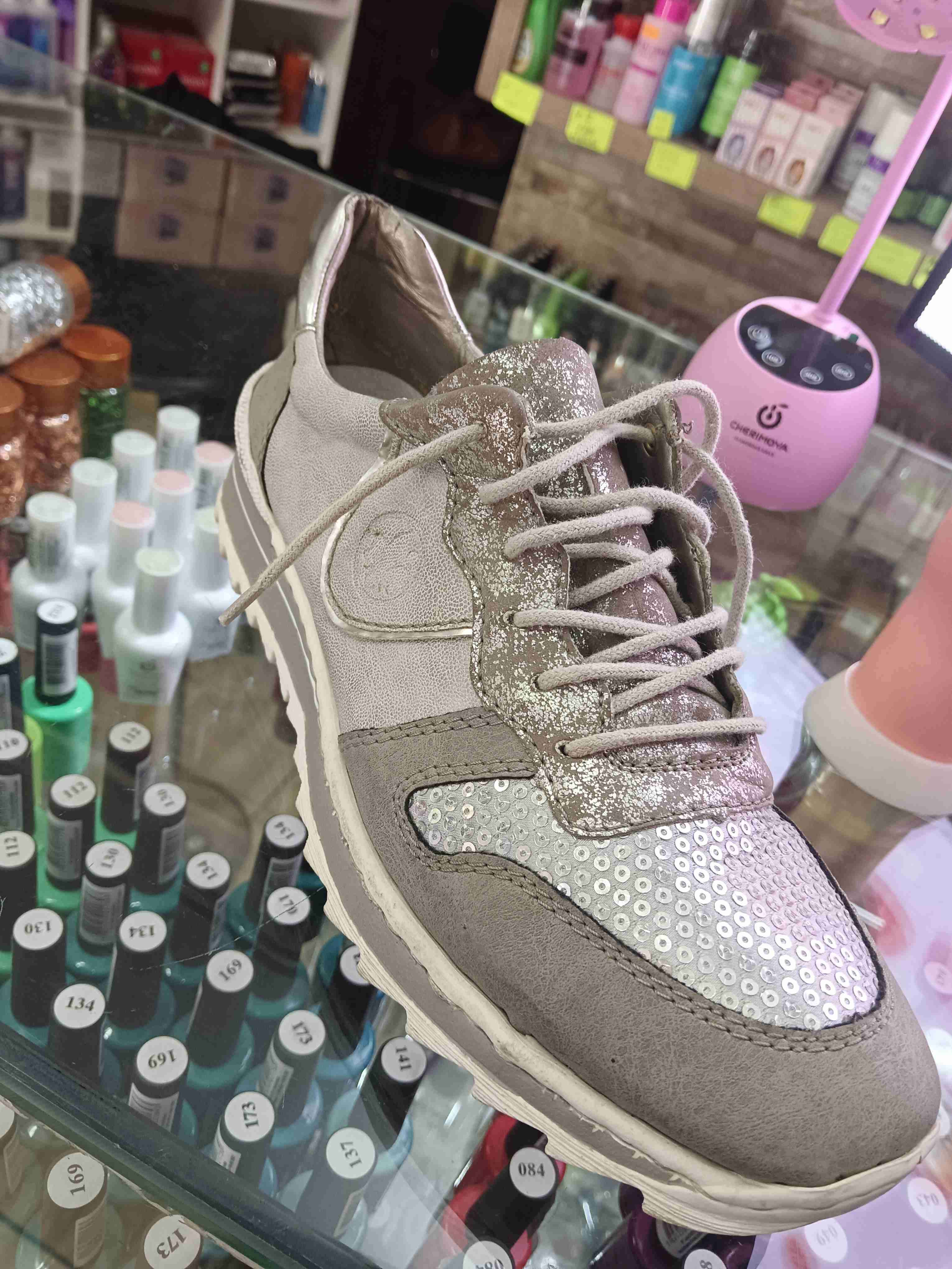Zapatilla deportiva gris con detalles de brillo, ideal para estilo casual. Buen estado con poco uso.