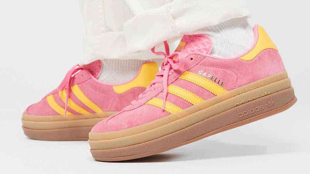 Zapatillas adidas en tonos rosados con detalles amarillos, ideales para un look deportivo y casual. En buen estado.