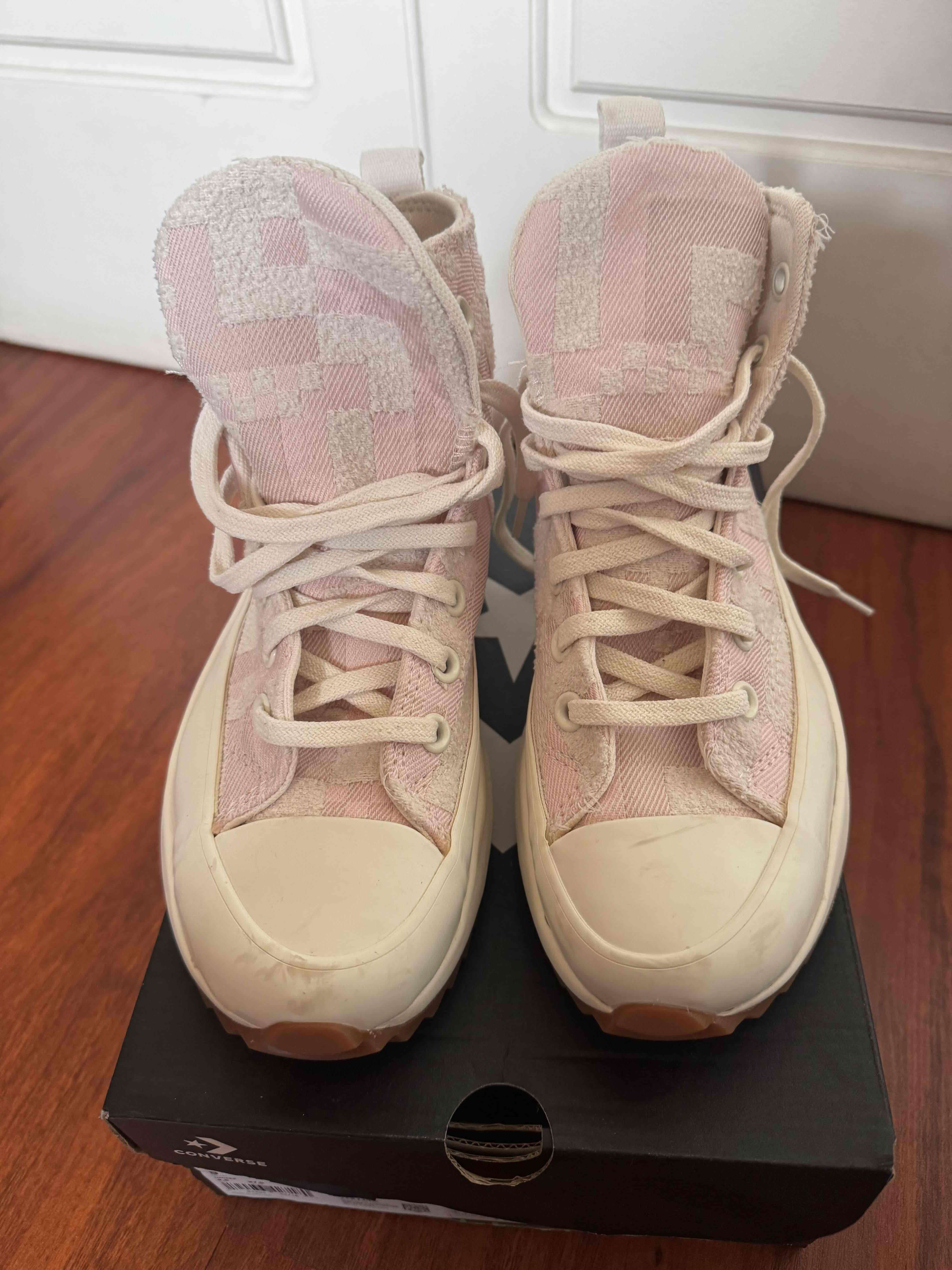 Zapatillas altas en color rosado claro, ideal para un look casual y moderno. Presentan ligeros signos de uso, pero en buen estado general.Numero 36,5, 23 cm en planta … poco uso como nuevas
