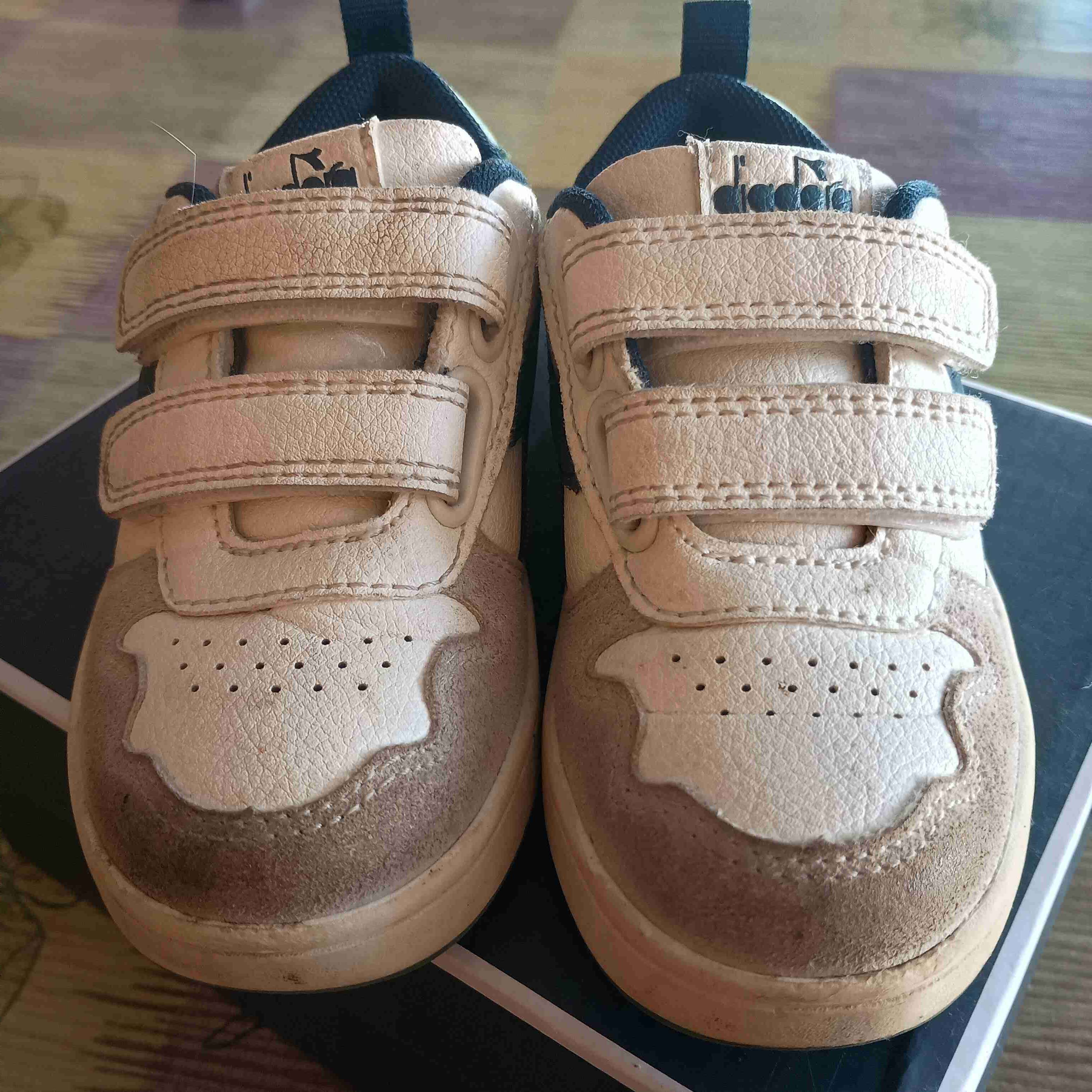 Zapatillas beige para niño con cierre de velcro, muestran signos de uso. Perfectas para el día a día. Número 24