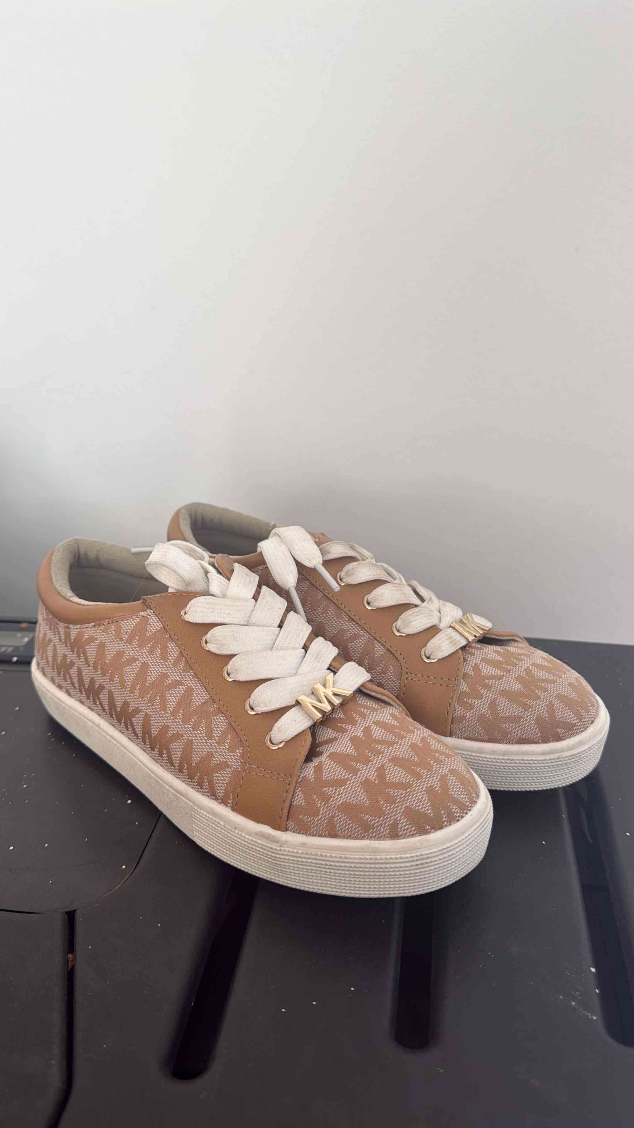 Zapatillas marrón con diseño de logo, cordones blancos y detalles dorados. En buen estado, ideal para uso diario.