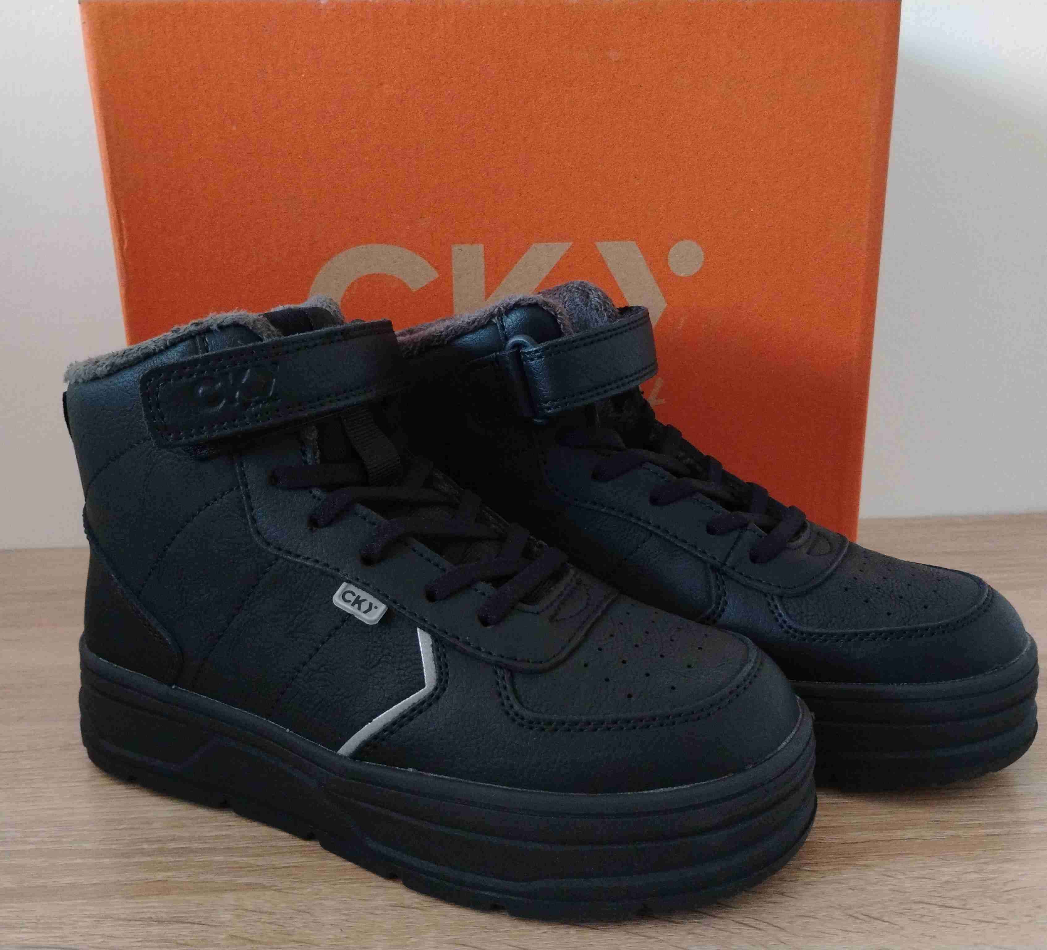 Zapatillas de caña alta negras CKY, con forro interior. Perfectas para el invierno, están nuevas en caja original. Talla 35, para un pie de 23,3 cms.