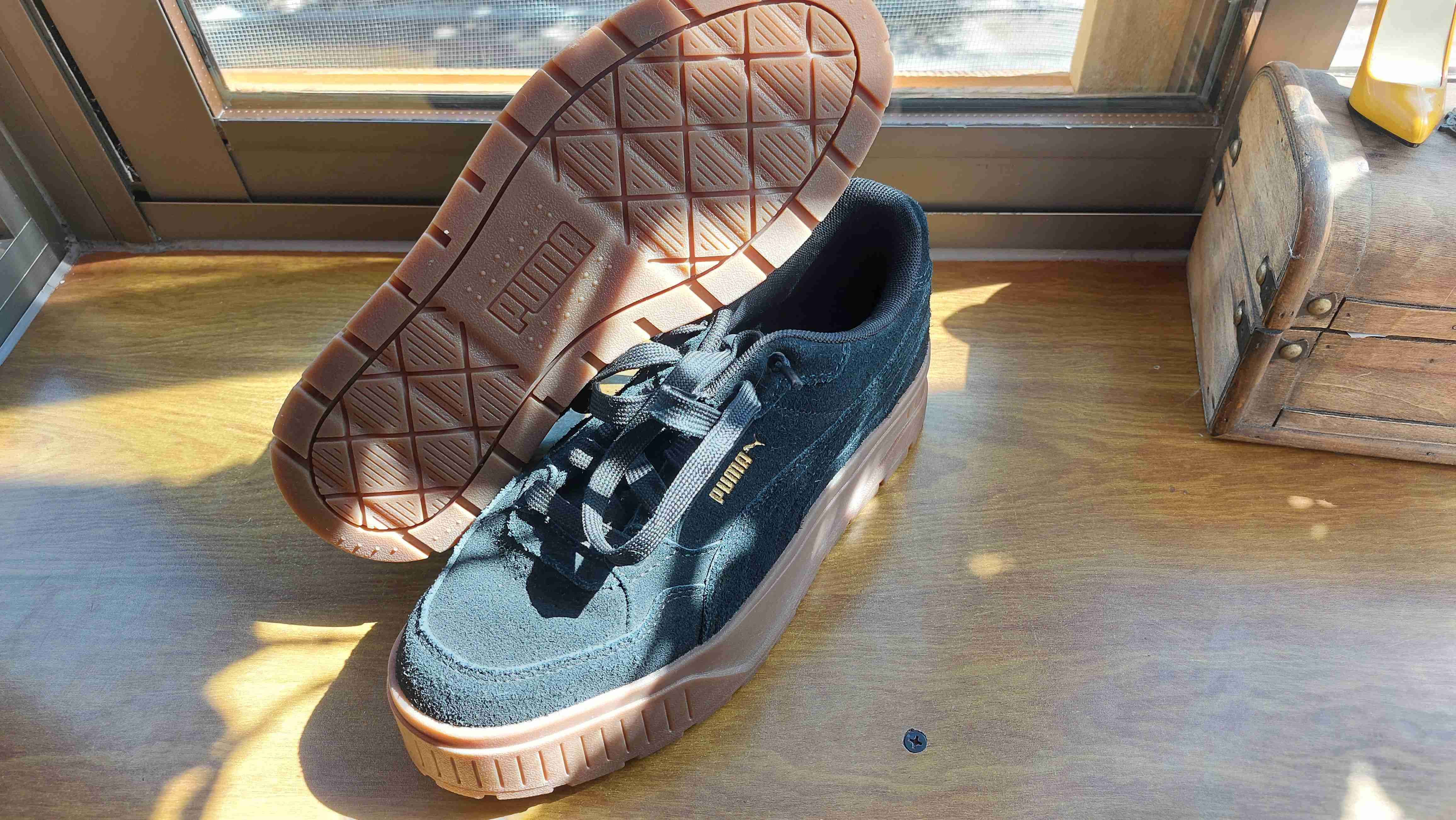 Zapatillas negras de gamuza marca PUMA modelo de KARMEN LI IDOL. Tienen la suela gruesa, de goma. Estan en buen estado, se ocuparon un par de días, pero la plataforma era demasiado alta para una chica de 1.75 :( A pesar de eso, son ideales para uso casual diario y para salir a carretear.