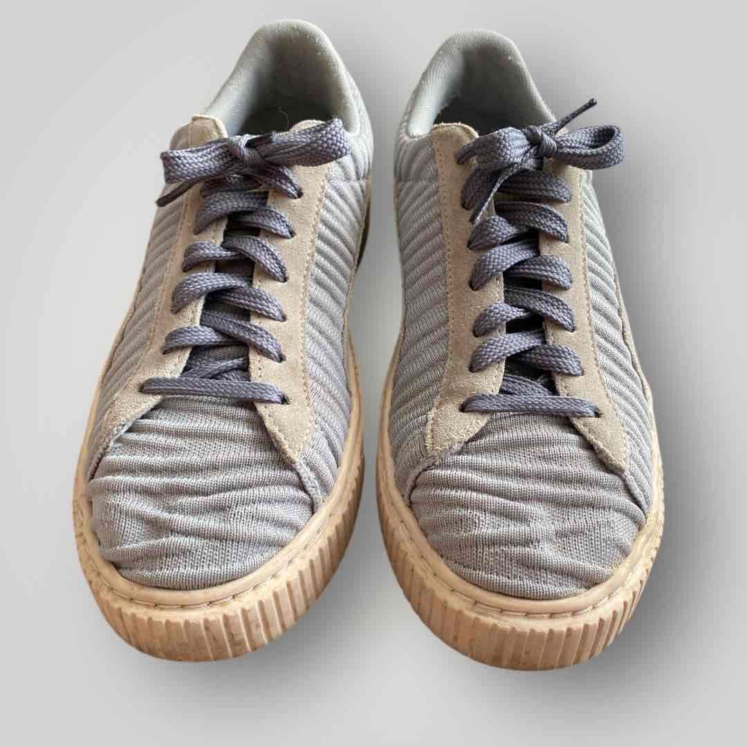 Zapatillas casuales grises en buen estado, con diseño texturizado. Ideales para uso diario. Gamuza y tela