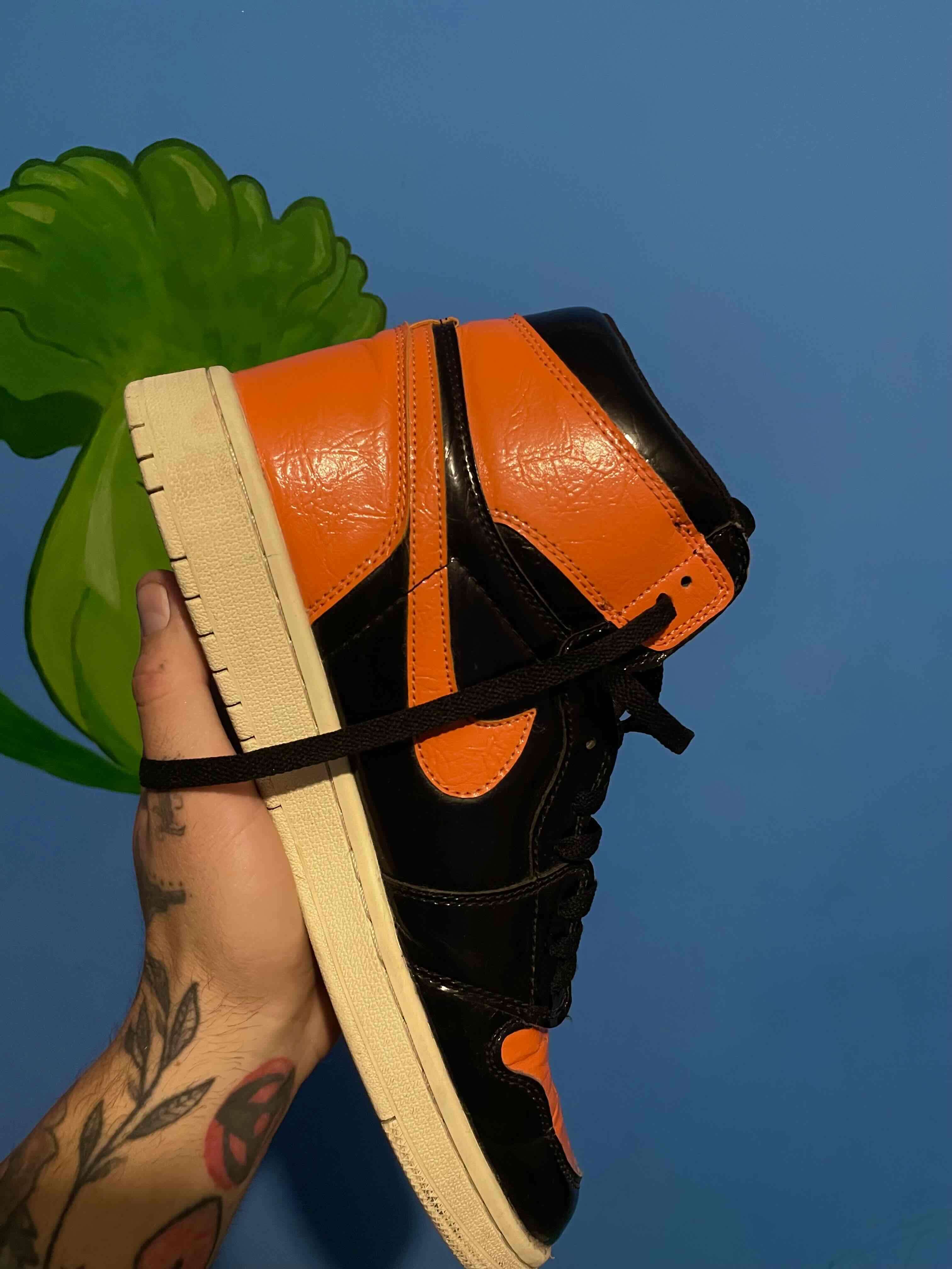 Zapatillas deportivas en negro y naranja, diseño moderno y juvenil. En buen estado. Talla 44.5/28.5 cm