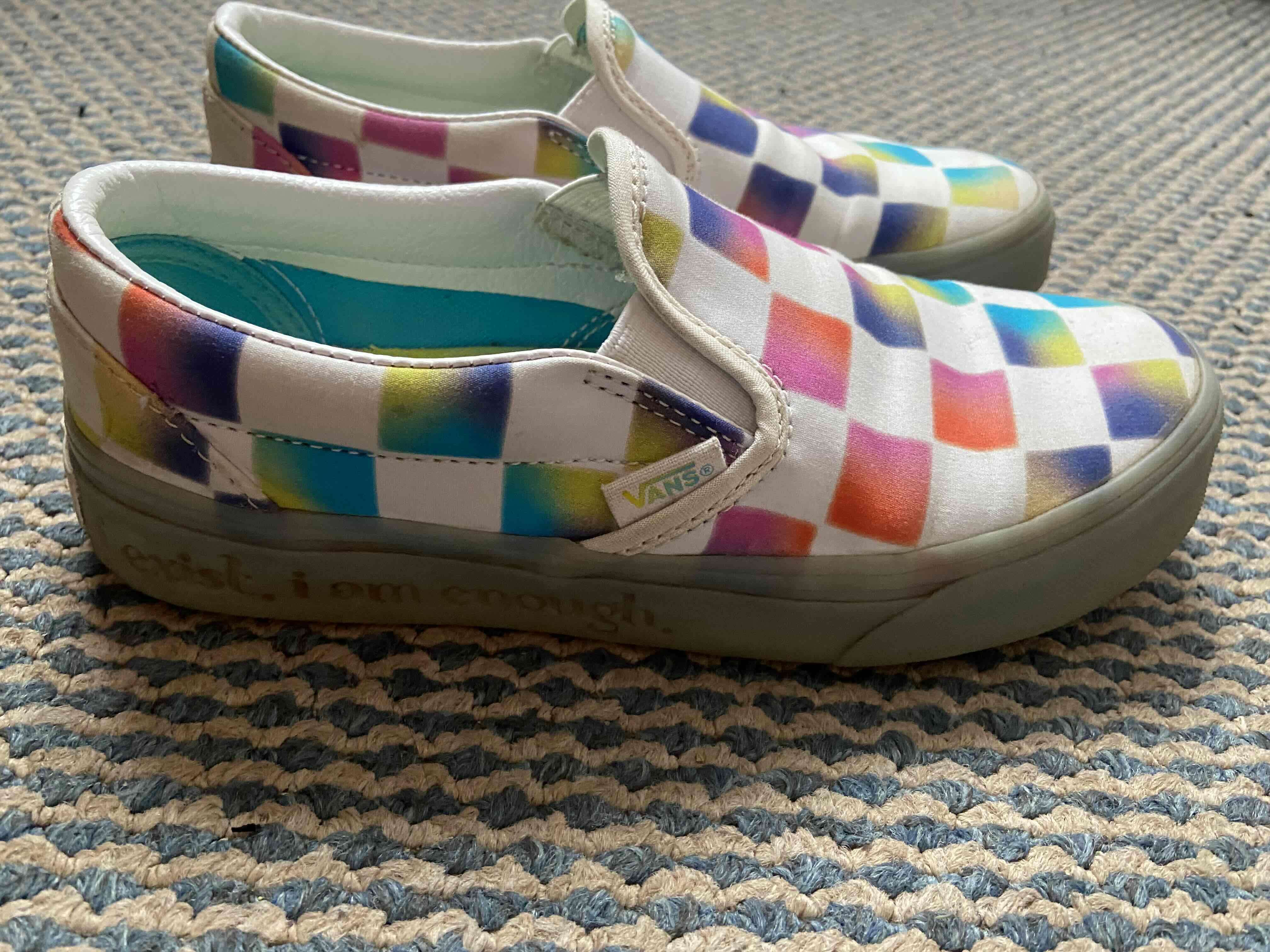 Zapatillas Vans con diseño de cuadros multicolores, estilo casual y moderno. En buen estado general, ideales para un look juvenil y relajado. SIN DETALLES