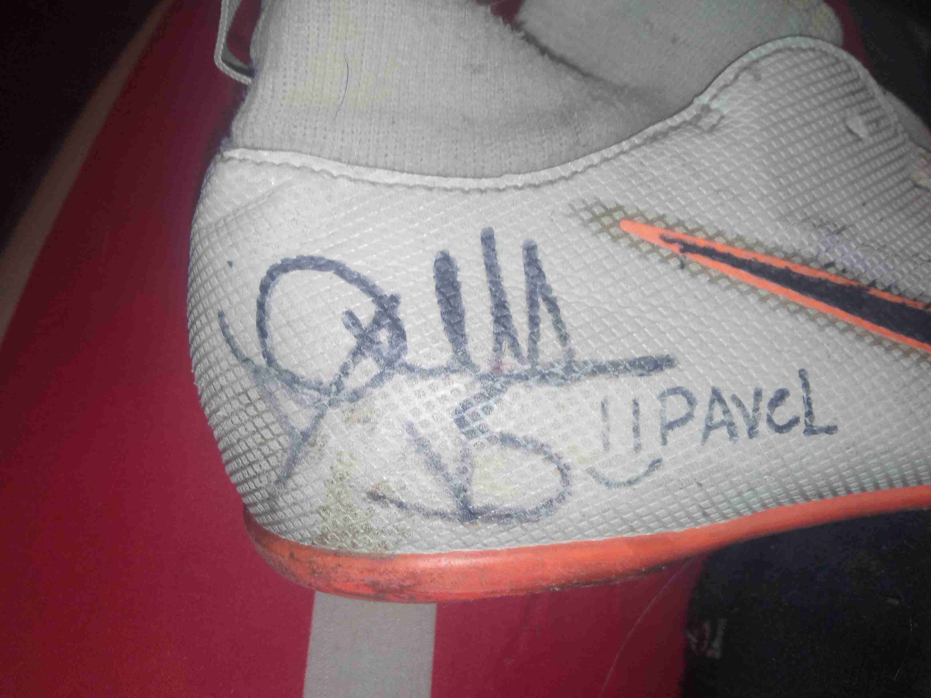Zapato deportivo blanco con detalles naranjas y firma. En buen estado, ideal para coleccionistas o fans. Firmado por aqua vs cuando vino a Quilpué por los incendio de febrero 2023
