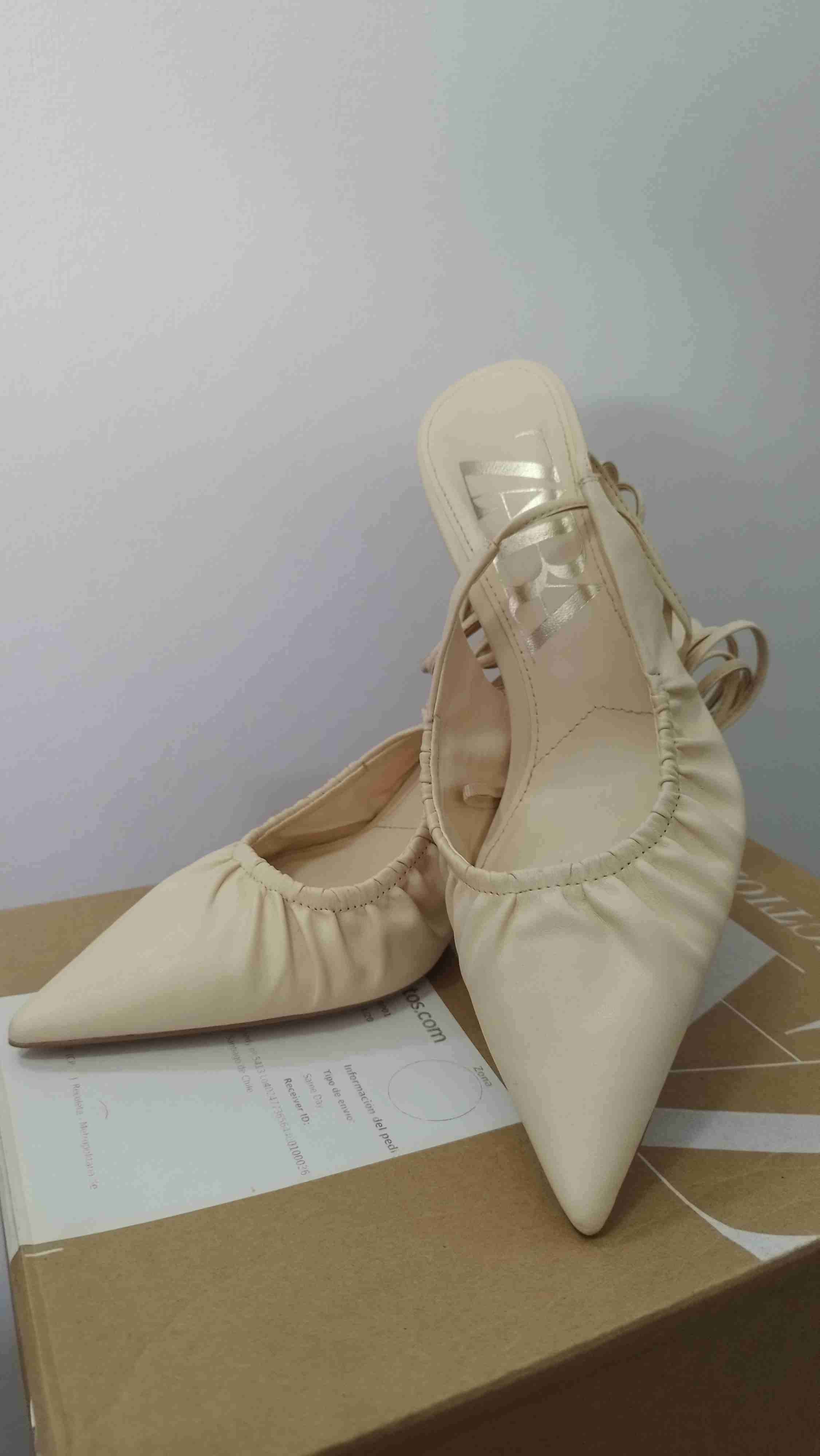 Zapatos de punta en color beige, estilo elegante y femenino. Perfectos para ocasiones formales. Taco de 10cm. Cordones para amarrar en pierna. Solo 1 uso