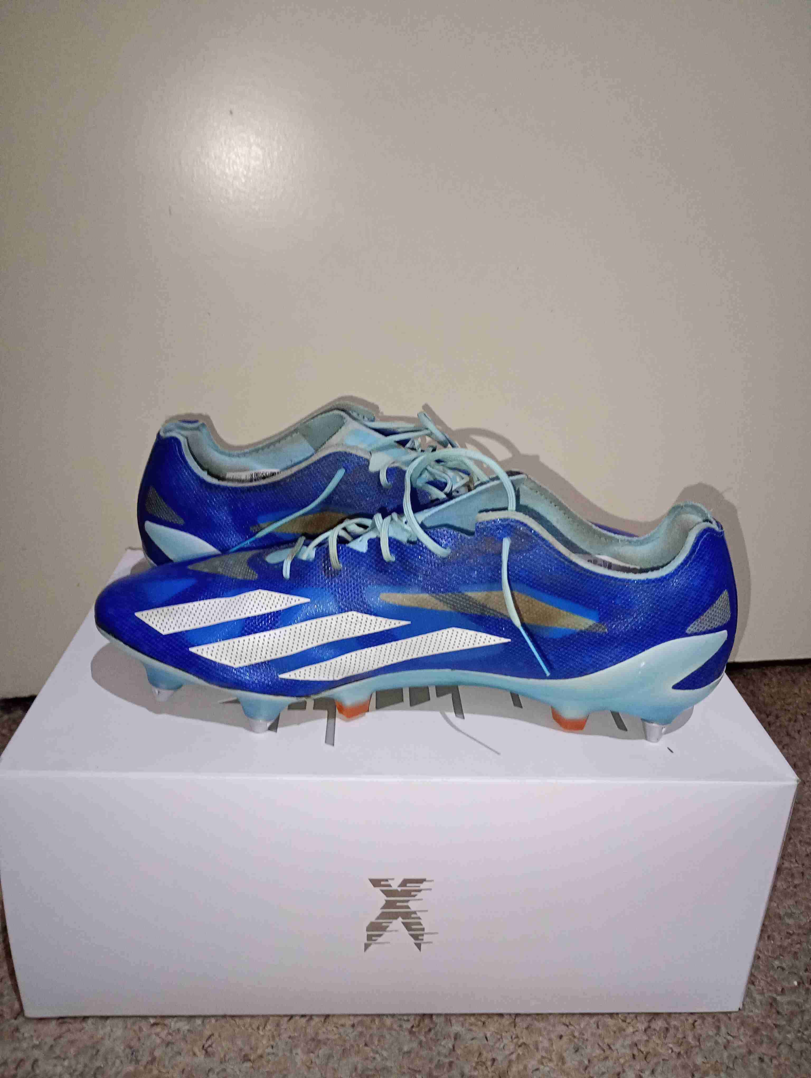 Zapatillas de fútbol en buen estado, con diseño moderno y color azul vibrante, perfectas para cancha de pasto. Ligero desgaste normal de uso.
