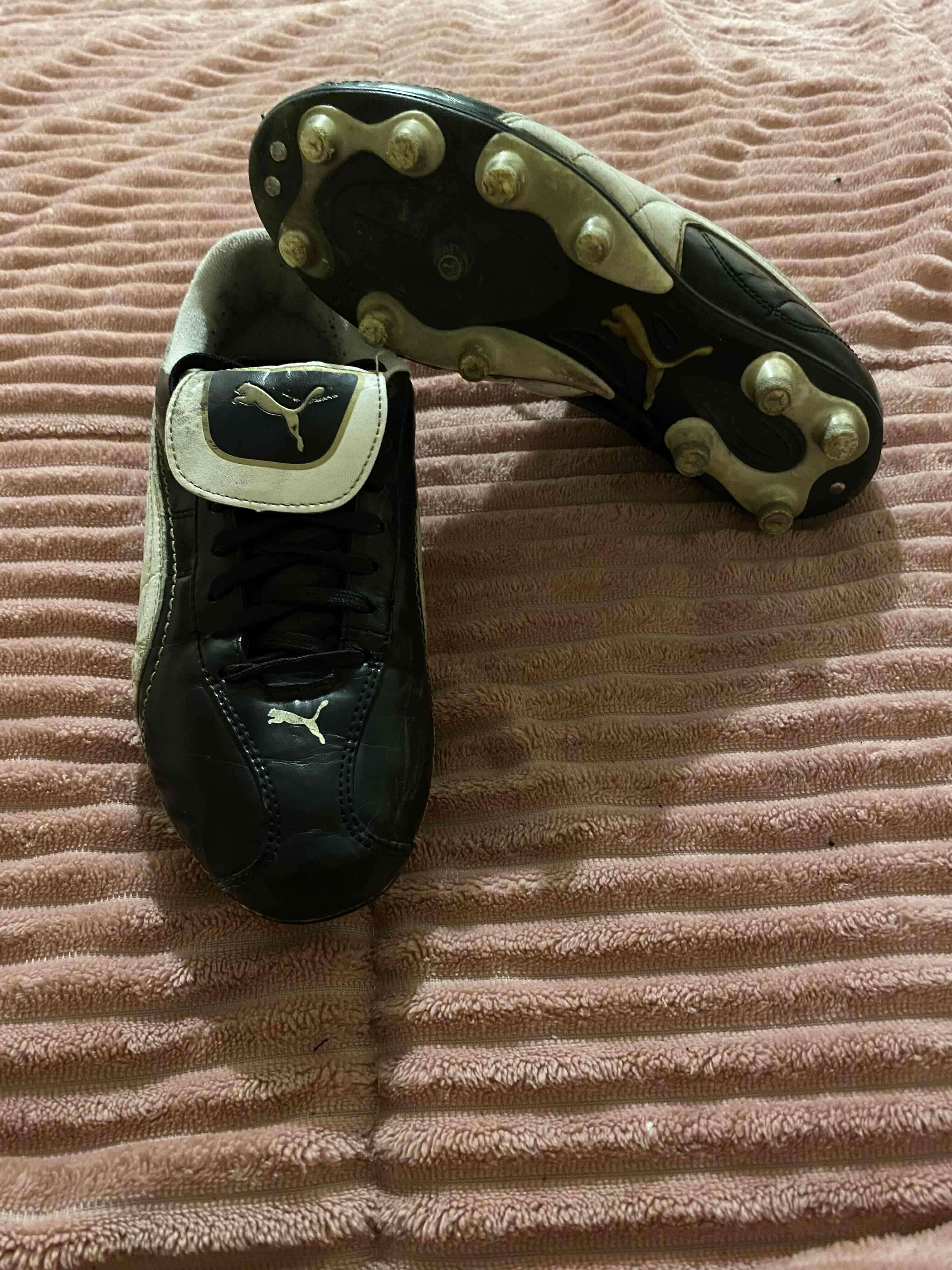 Botines de fútbol Puma en color negro, usados pero en buen estado. Ideales para cancha de pasto.